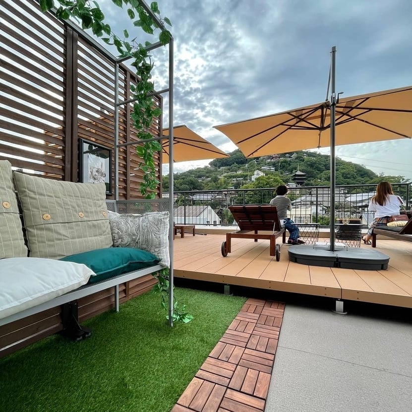 まち歩きのゴールは、尾道本通り商店街にあるホテル「Mange Tak Resort Onomichi(マングタックリゾート尾道)」。物語のラストを飾るインタラクティブアートや照明演出を体験したあとは、ホテル屋上にある「SKY bar Hygge & Fika」でランチ。屋上からは、その日巡ってきた尾道の景色が一望できます。