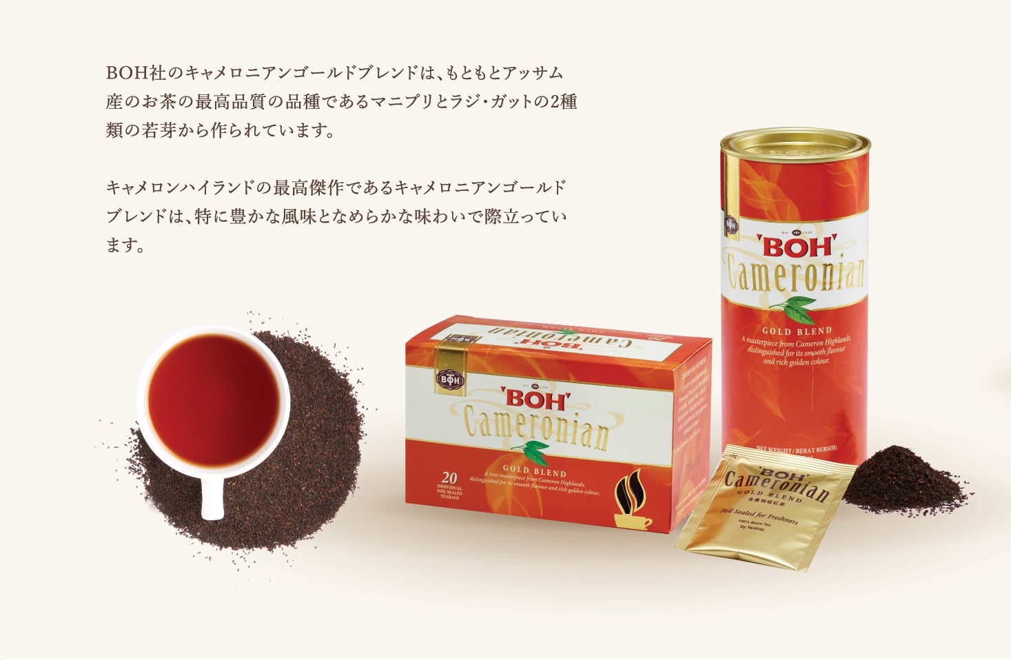 マレーシアの高原リゾートとしても知られるキャメロンハイランドで生産された茶葉のみを使用した紅茶で、渋みが少なくすっきりとした飲み口と、力強い味わいが特徴です。様々なハーブや、果実フレーバーとブレンドしたフレーバーティーがラインアップされていることも、世界中で人気である理由の一つです。自社ブランドで一貫して本格的なマレーシアのオリジナルティーを栽培、加工、包装、販売している、BOH社の代表商品です。マレーシア連邦政府総理府イスラーム開発庁が認証する、“ハラル認証” を取得していることも大きな特徴の1つで、サプライチェーンの全てにおいてハラル性を維持した、高級紅茶です。