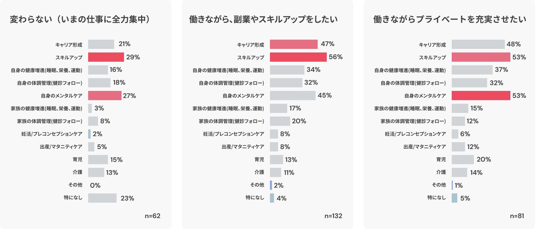 いまの仕事以外の活動やプライベートを充実させたいと考える人ほど、「キャリア形成」「スキルアップ」「メンタルケア」などの用途で、会社外のサービスの利用意向が高いという結果になりました。