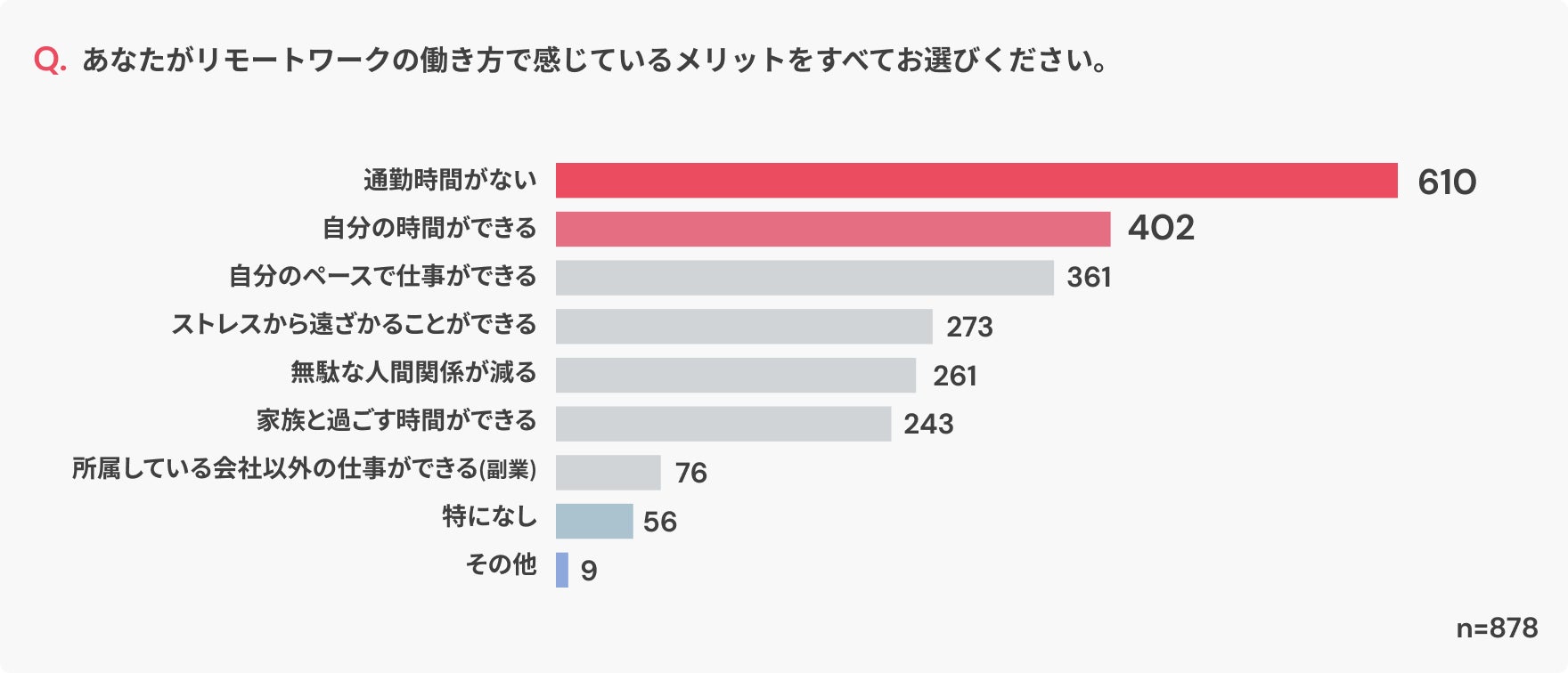 リモートワークに満足している理由としては、通勤時間がなくなったことで、自分の時間ができることがメリットと受け止められています。