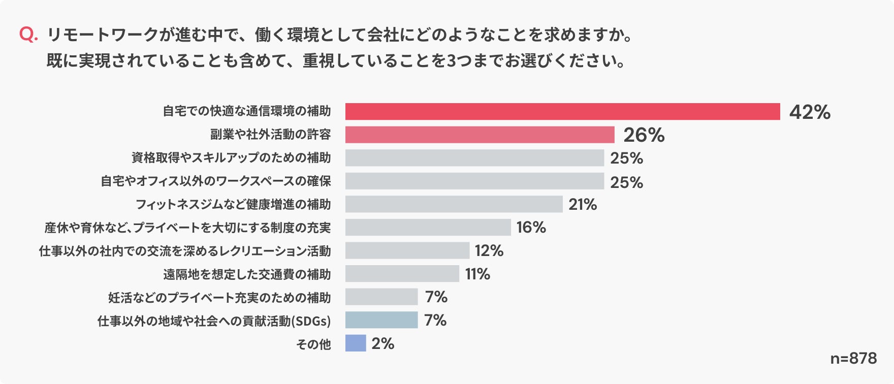 働く環境として会社に求めることは、在宅環境のサポートだけでなく、「副業や社外活動の許容」「資格取得やスキルアップのための補助」などが上位になりました。より自分を高めていくための活動に関心が向いているといえます。