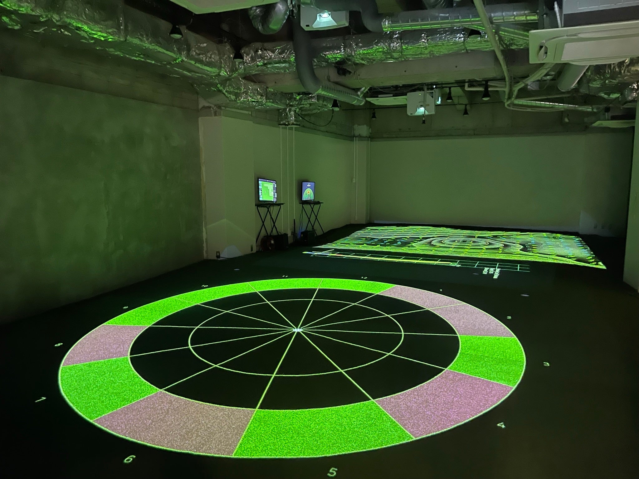 ①トラッキングカメラによる追跡システムで、打ったボール軌道をパターグリーンに投影。