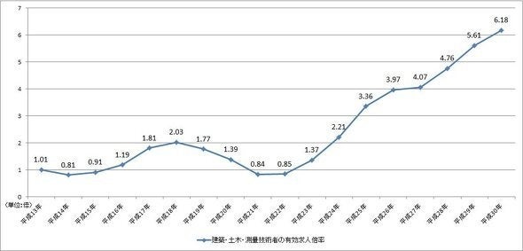 また、近年では建設作業員の人材不足も深刻です。建築・土木・測量技術者の有効求人倍率の推移を平成13年(2001年)から平成30年(2018年)までの推移を見ると、約20年間で倍率が6倍を超えていることがわかります。
