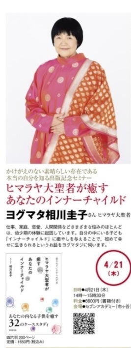 「ヒマラヤ聖者が癒す あなたのインナーチャイルド」の出版を記念して、世界文化社「セブンアカデミー」にて、ヨグマタ相川圭子の講演会を開催します。また同時にオンラインによる生配信も行います。