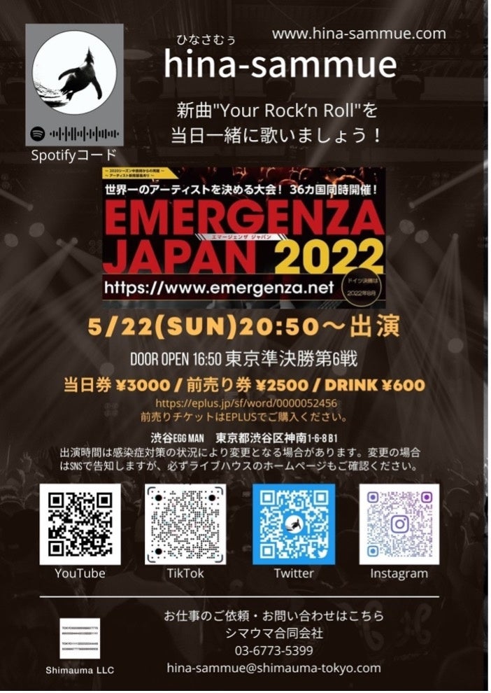 インナーブランディングを手掛けるシマウマ合同会社(所在地:東京都渋谷区、社長 兼 CEO:北村 元、以下「当社」)は、当社専属Rockユニット「hina-sammue(ひなさむう)」が5月22日(日)、東京・渋谷で開催される世界最大級のインディーズバンド・コンテスト・フェス「エマージェンザ・ジャパン2022」準決勝に出演することをお知らせします。公演では、hina-sammue が4月16日(土)にリリースしたニューシングル「Your Rock'n Roll」を披露します。