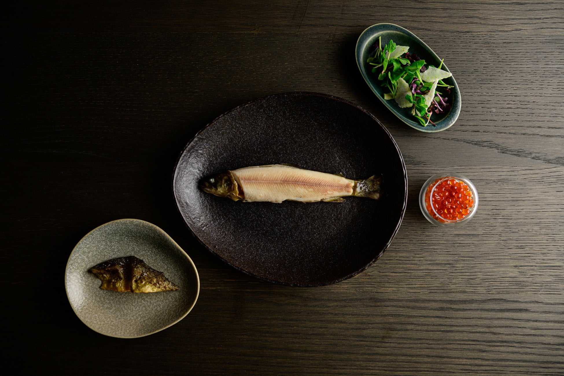 神奈川県 狩川で獲れるイワナを薪でスモーク。魚卵と自家製サワークリームと一緒に。