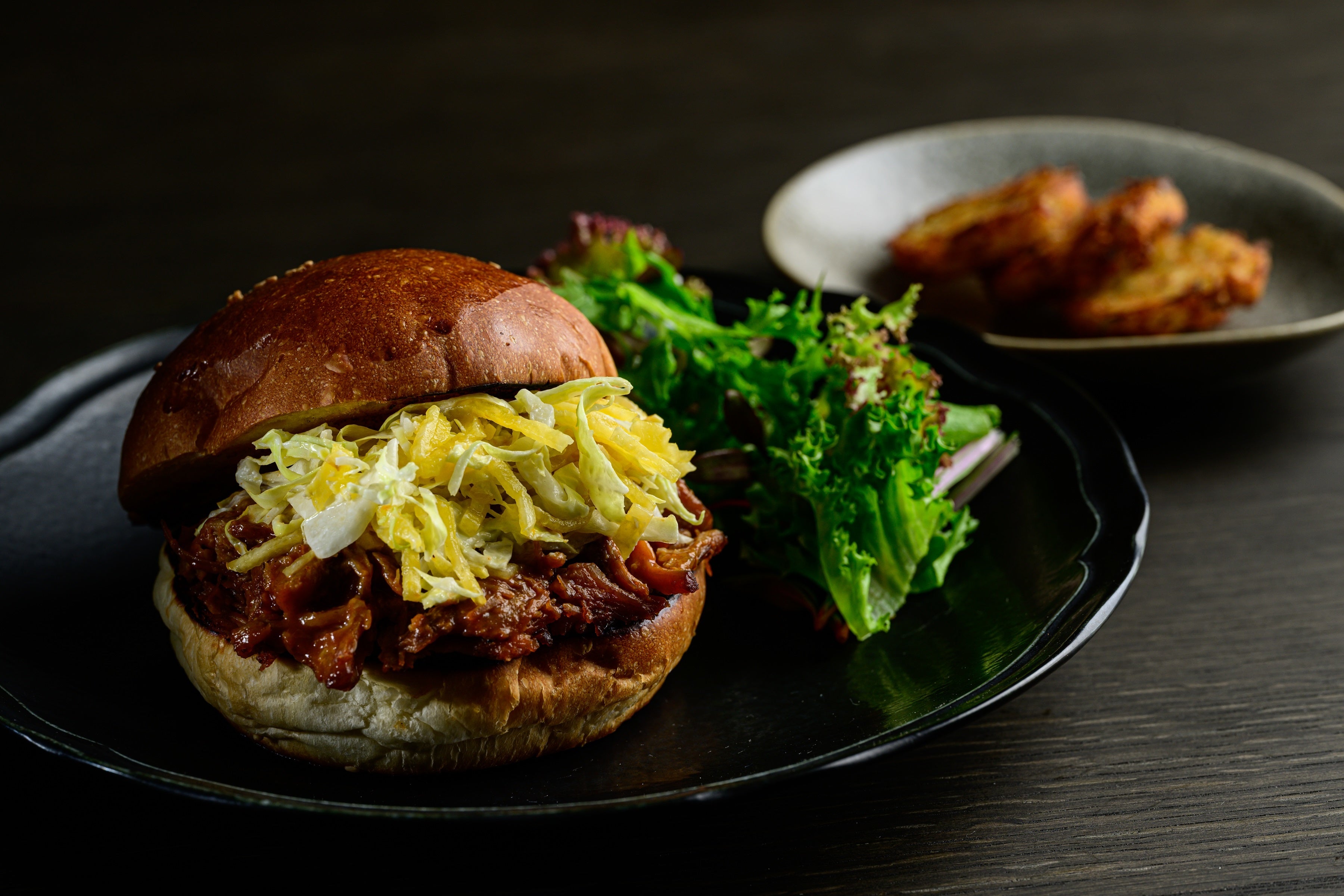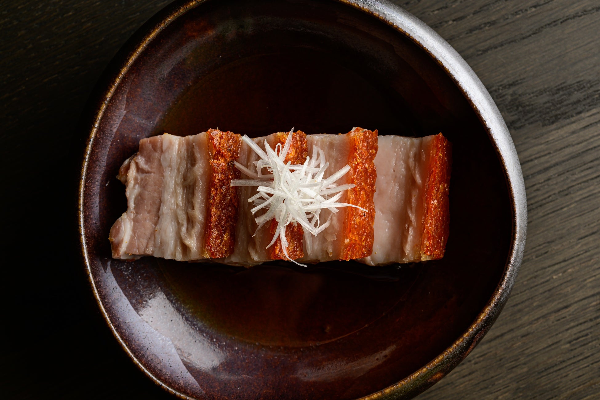 豚のバラ肉にゆっくりと24時間火入れし、薪で表面をクリスピーに仕上げ、自家製の三杯酢で仕上げました。