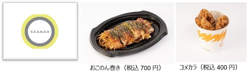 OKONONオリジナルソース焼きそば・志和のサムライネギ・チーズ・マヨネーズを豚肉と卵で巻いた、東広島市西条生まれの「おこのん巻き」は一度食べたらヤミツキになる美味しさ!米粉と西条酒を使ったご当地唐揚げ「コメカラ」や、日本一美味しいといわれる地元・安芸津産のじゃがいもで作った「レモンコロッケ」など豊富なラインナップ。