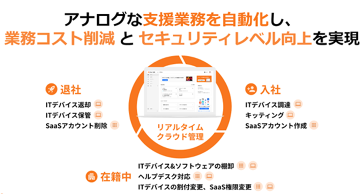 ITデバイス & SaaS の統合管理クラウド「ジョーシス」では、従業員に紐づけたITデバイス・SaaSの台帳管理や、入退社に伴うSaaSアカウント発行・削除、退職者の削除漏れアカウントの検知、PC購入やキッティング・ヘルプデスクのアウトソースなど、あらゆるコーポレートIT業務を自動化する機能を提供し、コーポレートITの業務負荷を軽減し、セキュリティ体制を強化します。