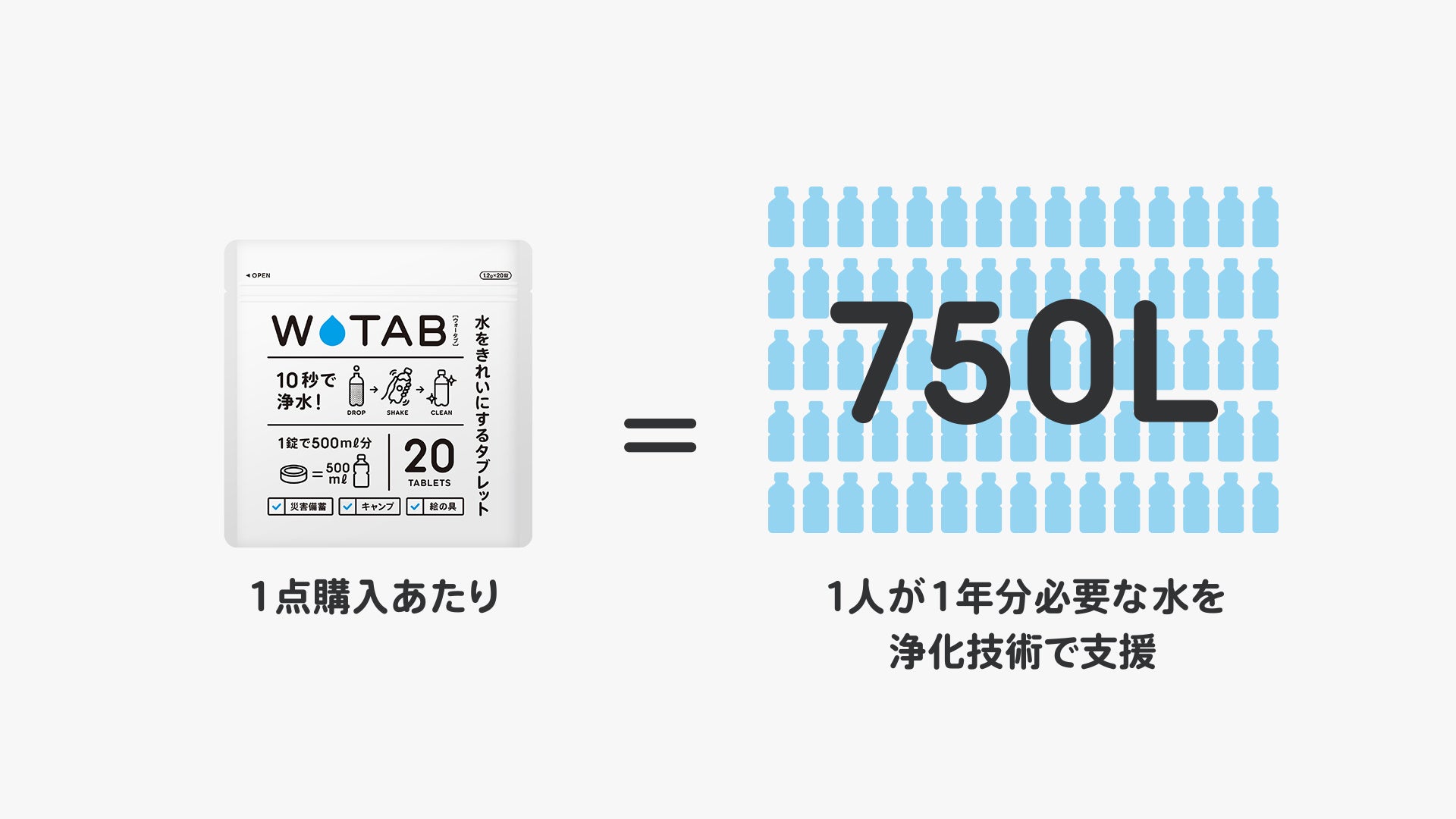 また、WATAB1点の購入につき、1人が1年間に必要とする飲料水(約750L)を発展途上国にて支援を行います。