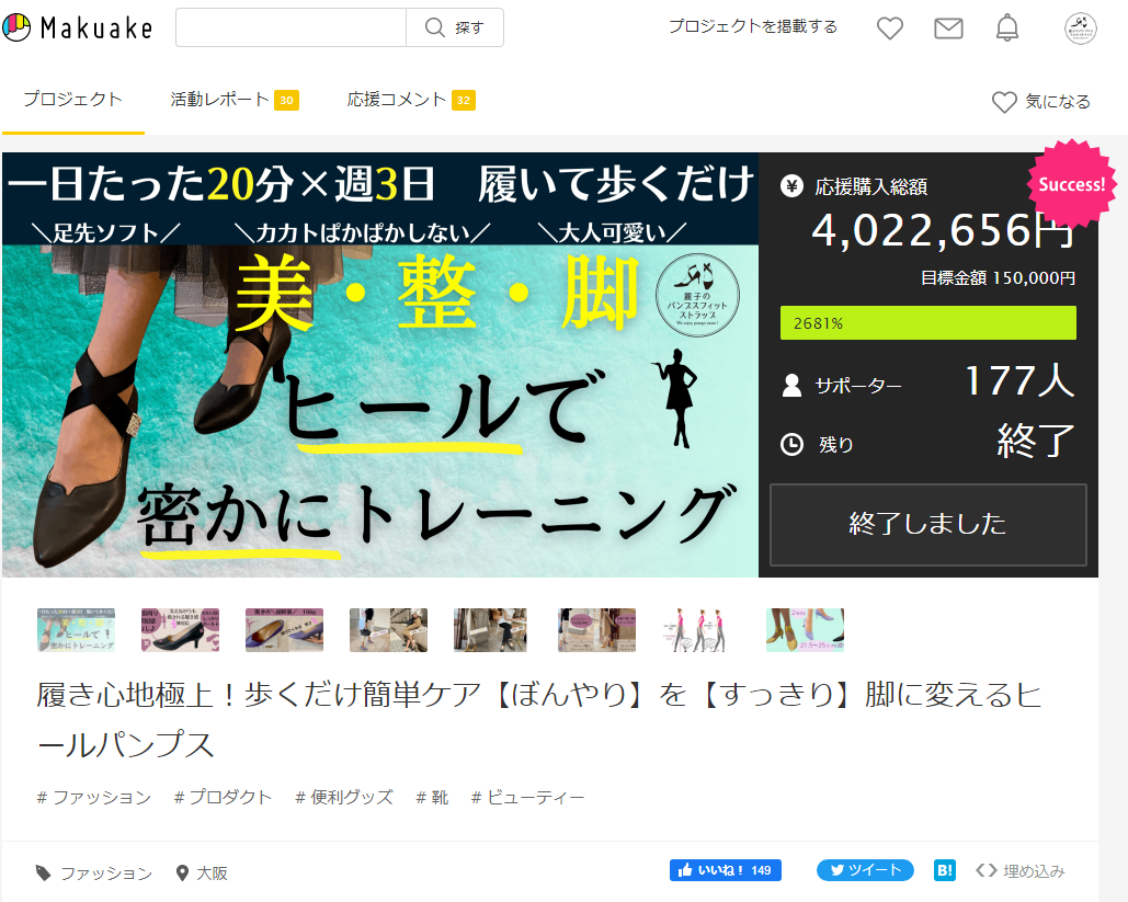 それを現したのが、2022年4月~5月 クラウドファンディングMakuake で販売スタートをした「麗子のパンプス」です。初日で160万円の売り上げを突破し 最終177名 402万円の応援購入でサクセスをしました。