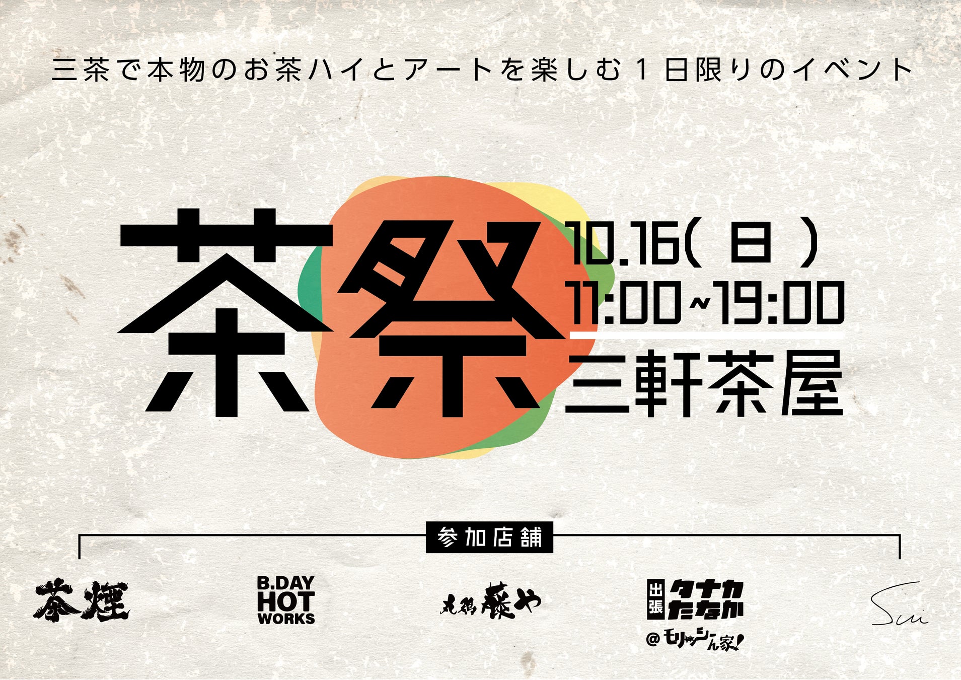 「三茶ハイ」と、それにに合わせて参加店舗が考案したオリジナルメニューとを楽しみながら1日限りのお茶のお祭をお楽しみください。