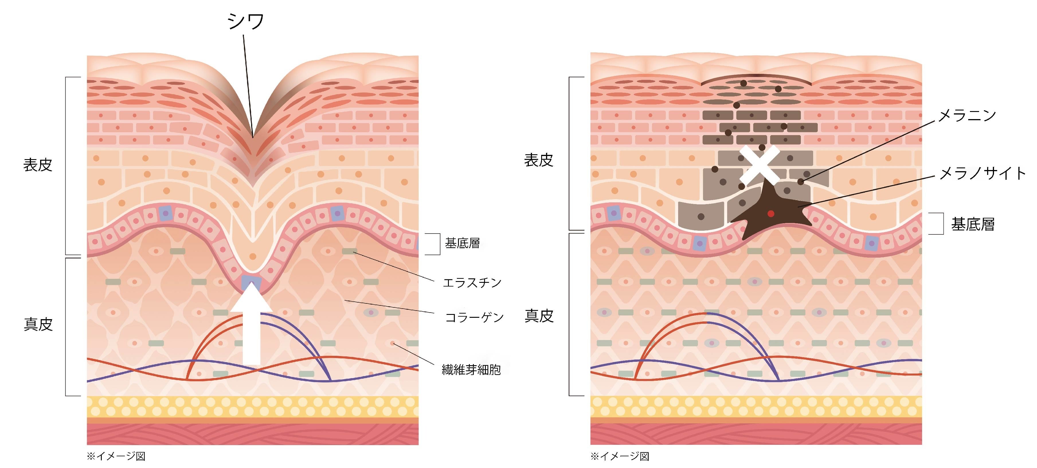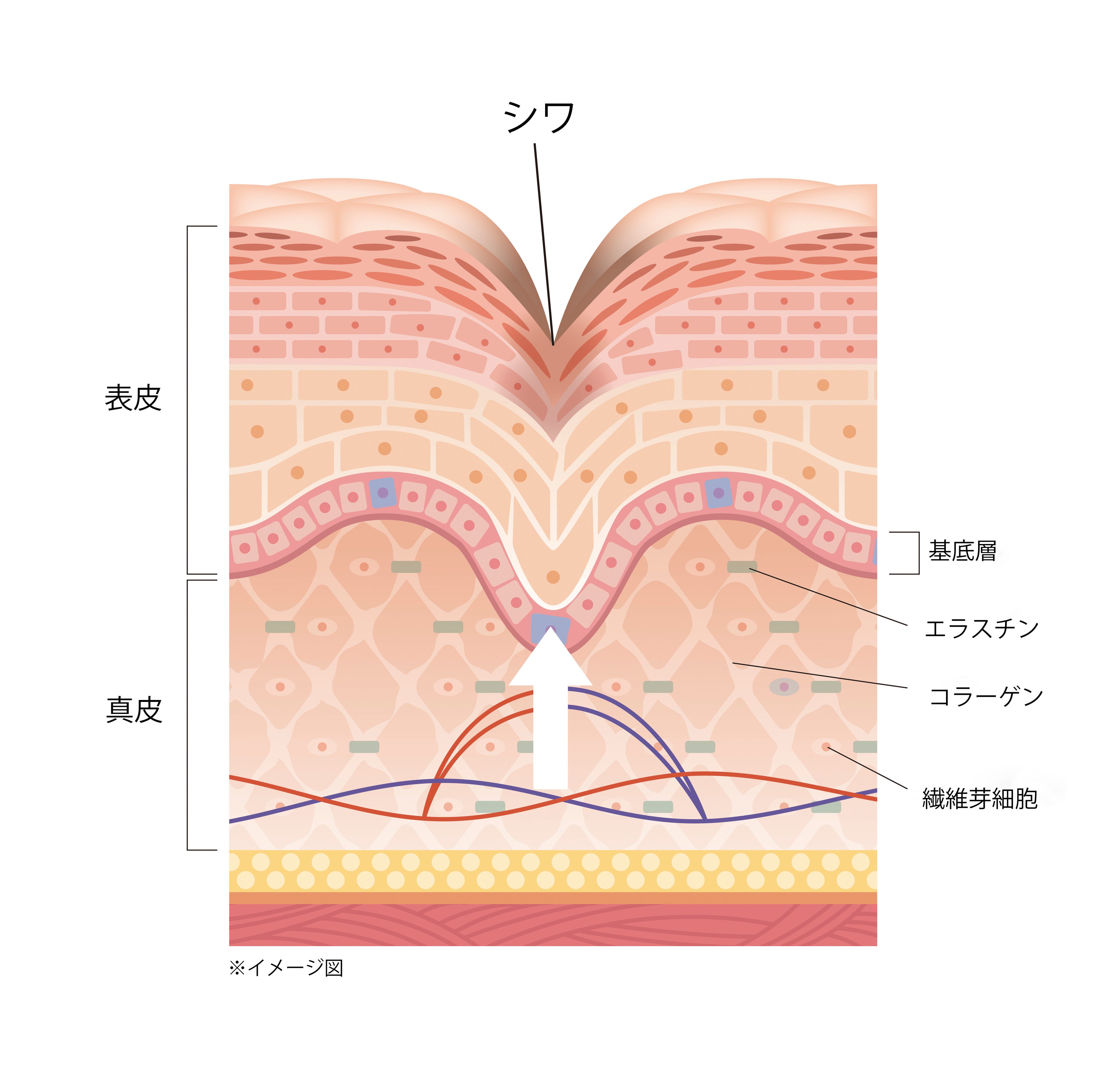 繊維芽細胞にアプローチして「コラーゲン」の産生を促進。肌の凹みを押し上げ、表面と内側からシワを改善して弾む肌へ。*有効成分:ナイアシンアミド