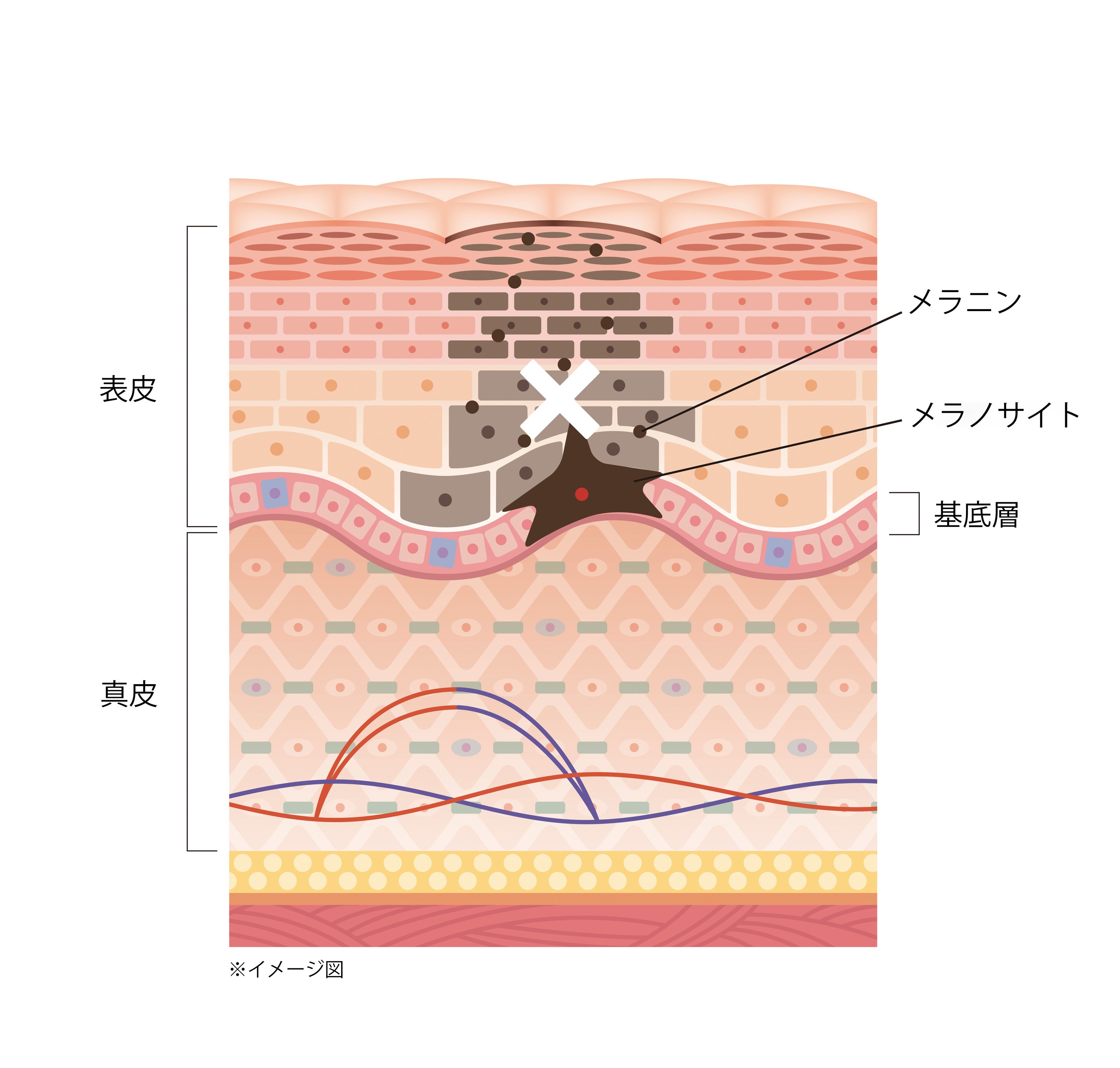 メラノサイトで生じるメラニンの過剰な生成をブロック。(メラノサイトで生じるメラニンの輸送を止める)徐々に濃く定着してしまう「シミ」と今あるシミを防ぎ明るい目元へ。*有効成分:ナイアシンアミド