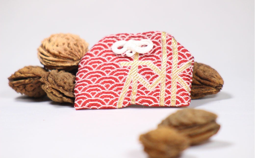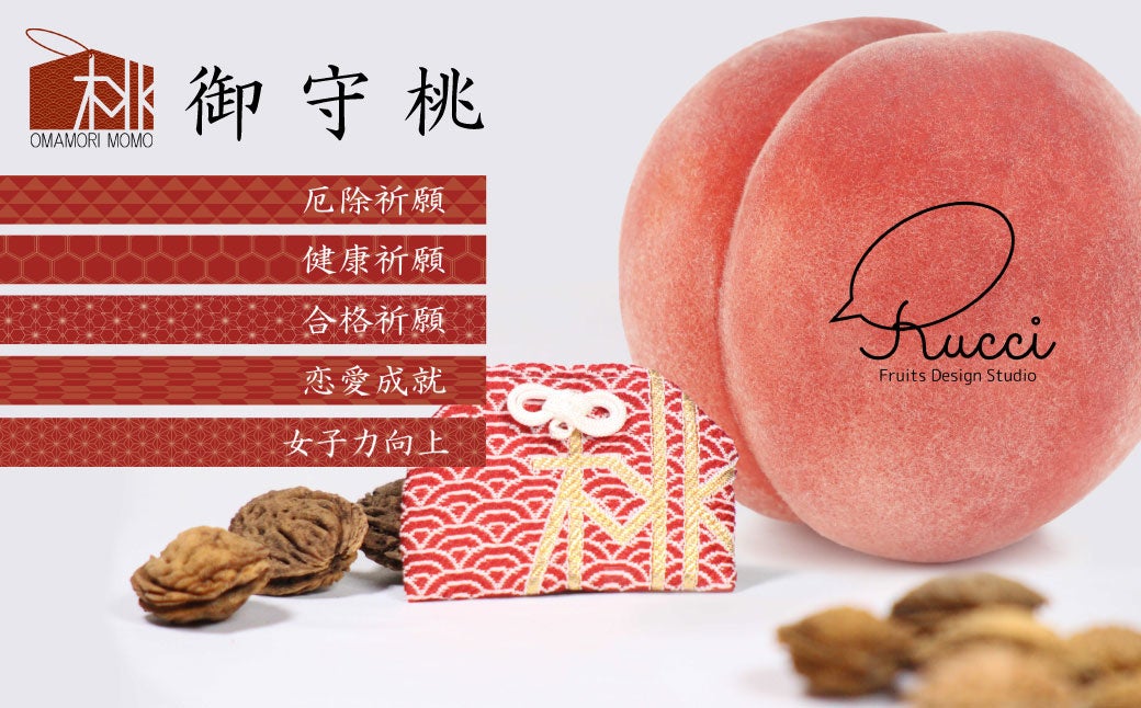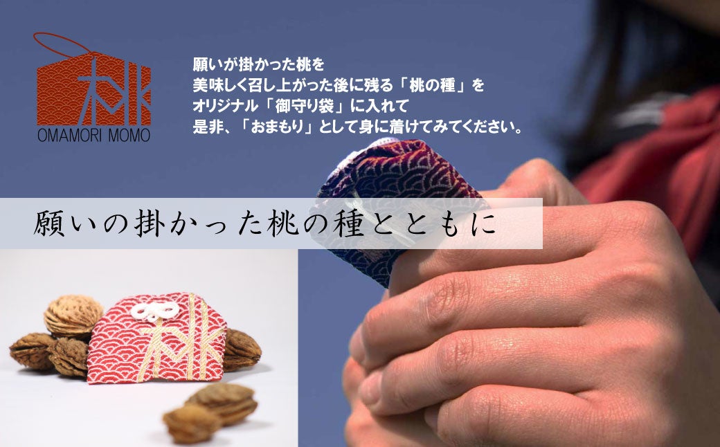 美味しく召し上がっていただいた後に残る、願いが掛かった桃の種がお守りの役目を果たします。織物産業が盛んな山梨県富士吉田市の織物職人とともに造ったオリジナルの桃の種用「御守袋」が同梱されます。