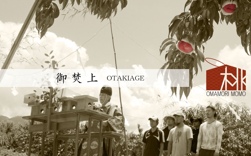 無事に桃が育成すると、この「果実袋」は取り外されます。桃の生産量日本一を誇る笛吹市の農作物をお守りくださるコノハナサクヤヒメを祀る甲斐國一宮浅間神社の宮司様に桃畑にて、無事に桃が成長したことへの感謝と、桃を食される皆様の願いが無事にかないますよう農家とともにお祈りをしていただいております。