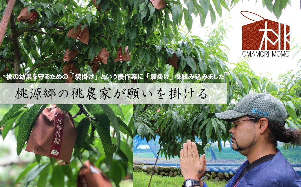 育成中の幼果を守るための『果実袋』に、桃農家が願いを掛けて、願い事ごとに桃の木を分けて袋を掛けさせていただきます。