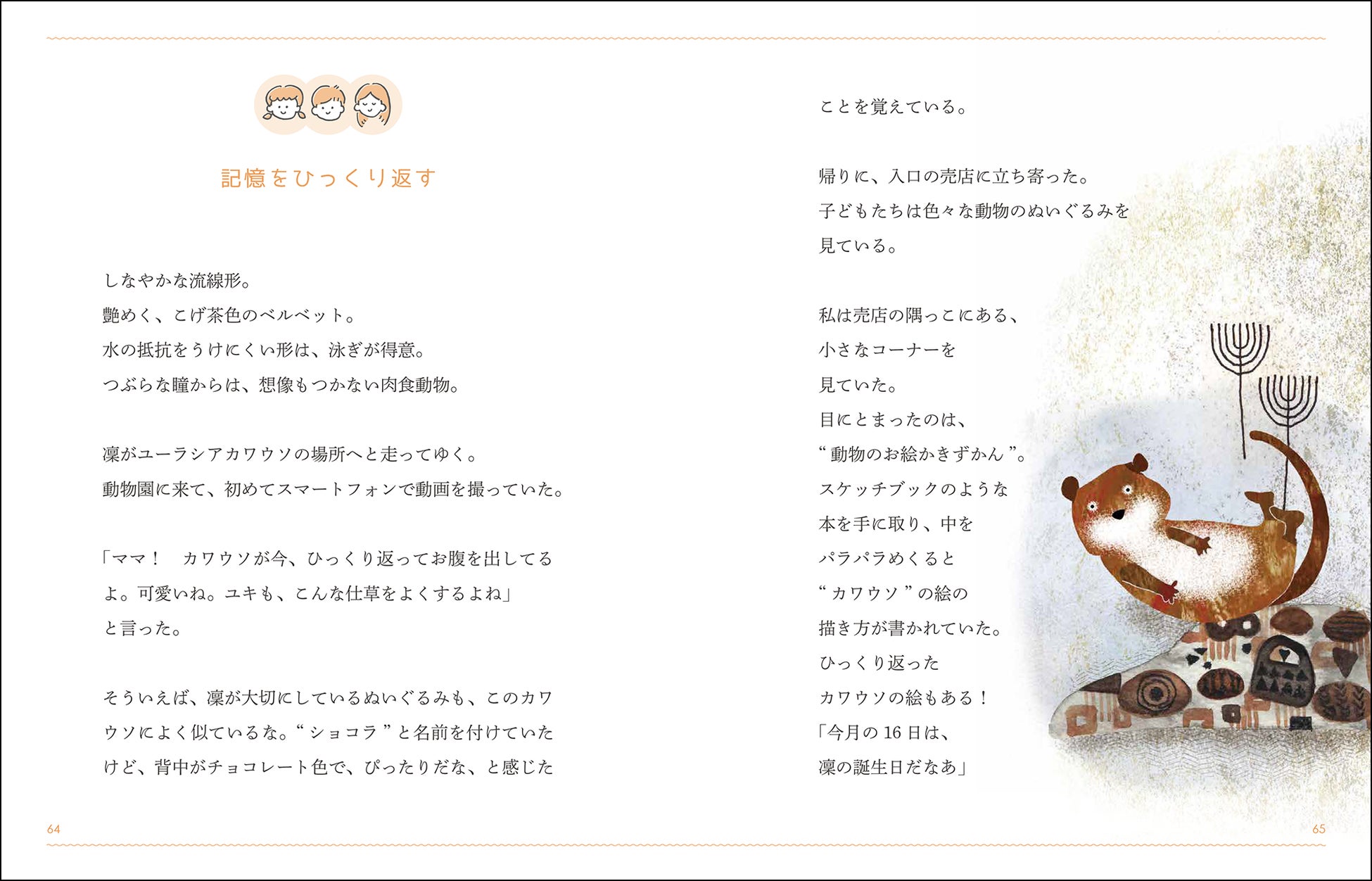 疲れたママの背中をお風呂で洗いながら竜巻を起こしてくれる柚ちゃん。しもやけのママの代わりにパスタを作ってくれる龍くん。自分が死んでしまった後のママの未来を予言する凜ちゃん。それぞれの世界観を持った子どもとの時間を、小さなストーリーに閉じ込めた。成長すれば母も子も忘れ去ってしまうであろう一瞬は、日常こそがかけがえのないドラマだと気づかせてくれる。