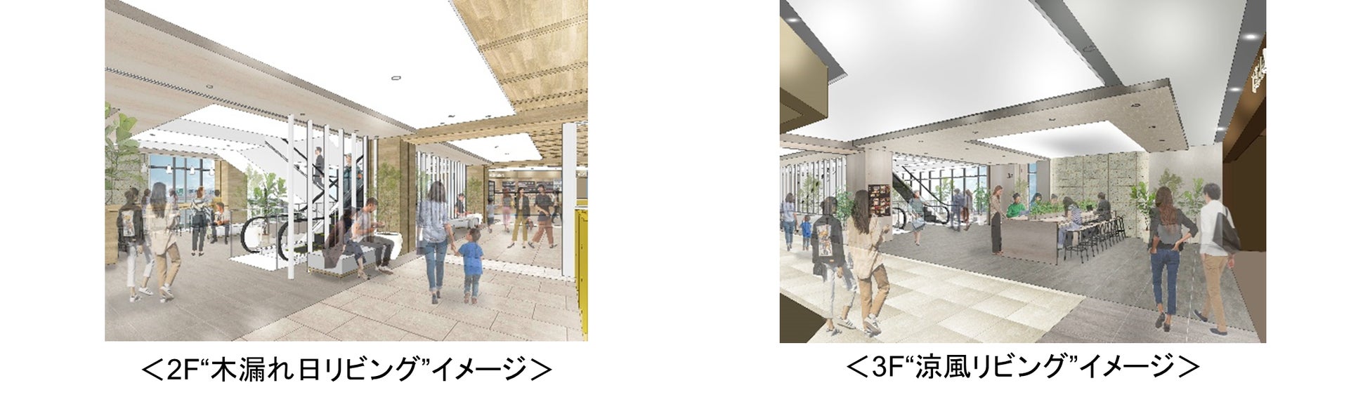 特に本施設の2F、3Fはそれぞれ、緑のテラスに連想した温もりのある「木漏れ日テラス」、風のホワイエに連想したスタイリッシュな「涼風テラス」を空間コンセプトに、個性的な店舗が集積した賑わいのあるフロア構成としています。