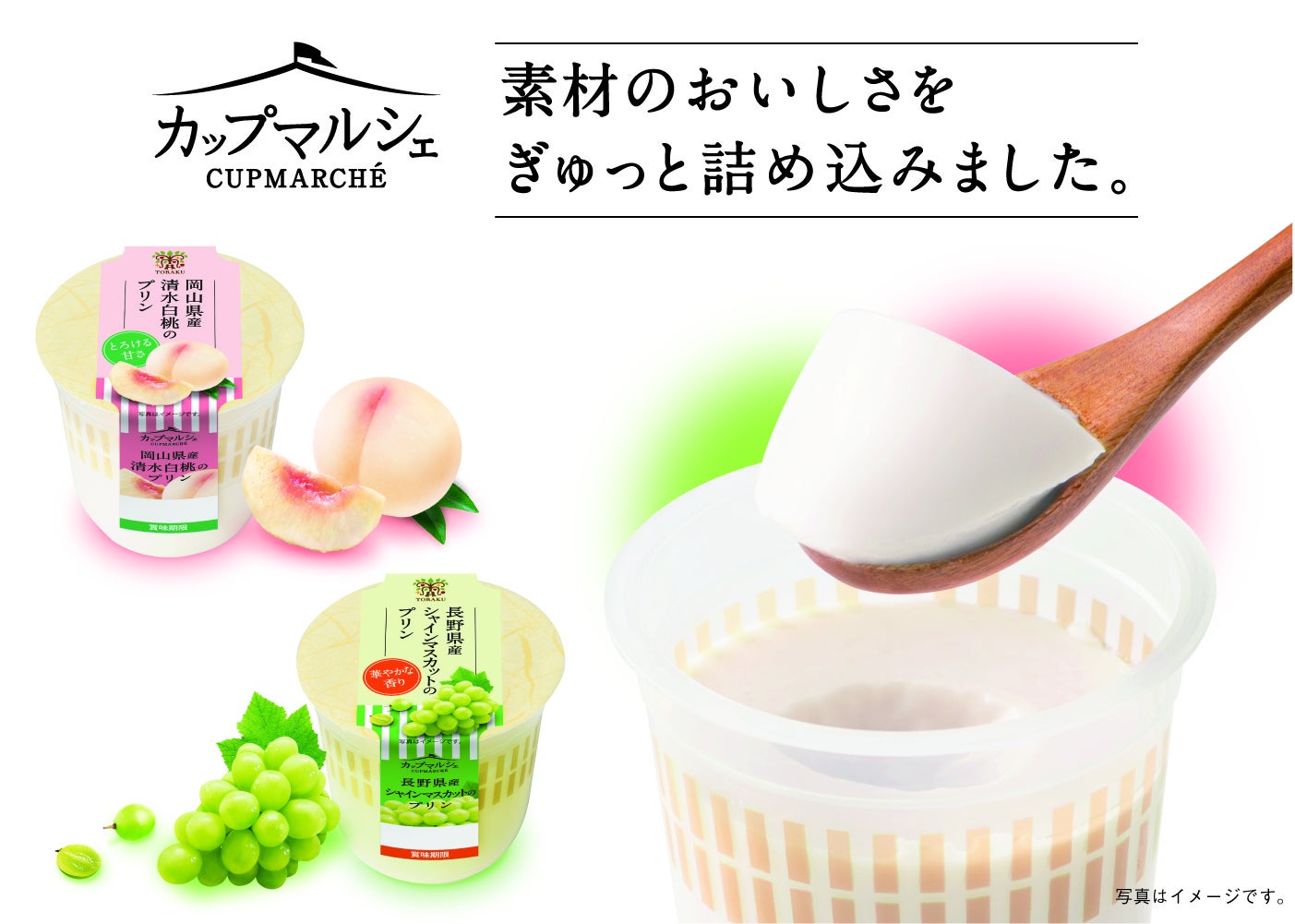 「カップマルシェ 長野県産シャインマスカットのプリン」「カップマルシェ 岡山県産清水白桃のプリン」を2022年6月6日(月)より発売いたします。