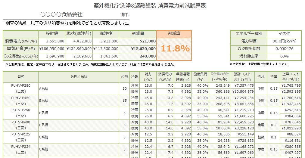 電気料金が高騰する昨今、電力料金の抑制および地球温暖化対策に向け、Co2排出量削減への取り組みが求められております。従来の技術では、空調設備のメンテナンス施工後の電力削減効果を可視化することに多くの時間とコストがかかるという課題がありました。本特許技術は、空調設備の能力、稼働時間、汚れ具合などを考慮し、弊社が提供する省エネメンテナンス施工のひとつである室外機洗浄塗装サービス「ササカン式空調室外機遮熱塗装(商標登録第6756805号)」施工後の、電力削減量を素早くかつ正確に推定するシステムと検証方法となります。