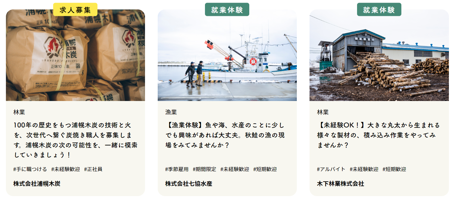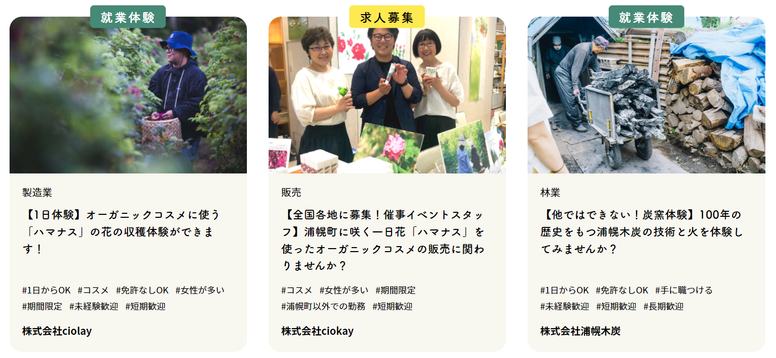 その町での生活を少し覗いてみたい、長期の就労だと自分に合うかどうか分からない、といった方に向けて、短期の就労体験の受入も町内企業と協力して行っています。受入事業者については、事業内容に加え、代表・社長からのコメントも見ることができます。