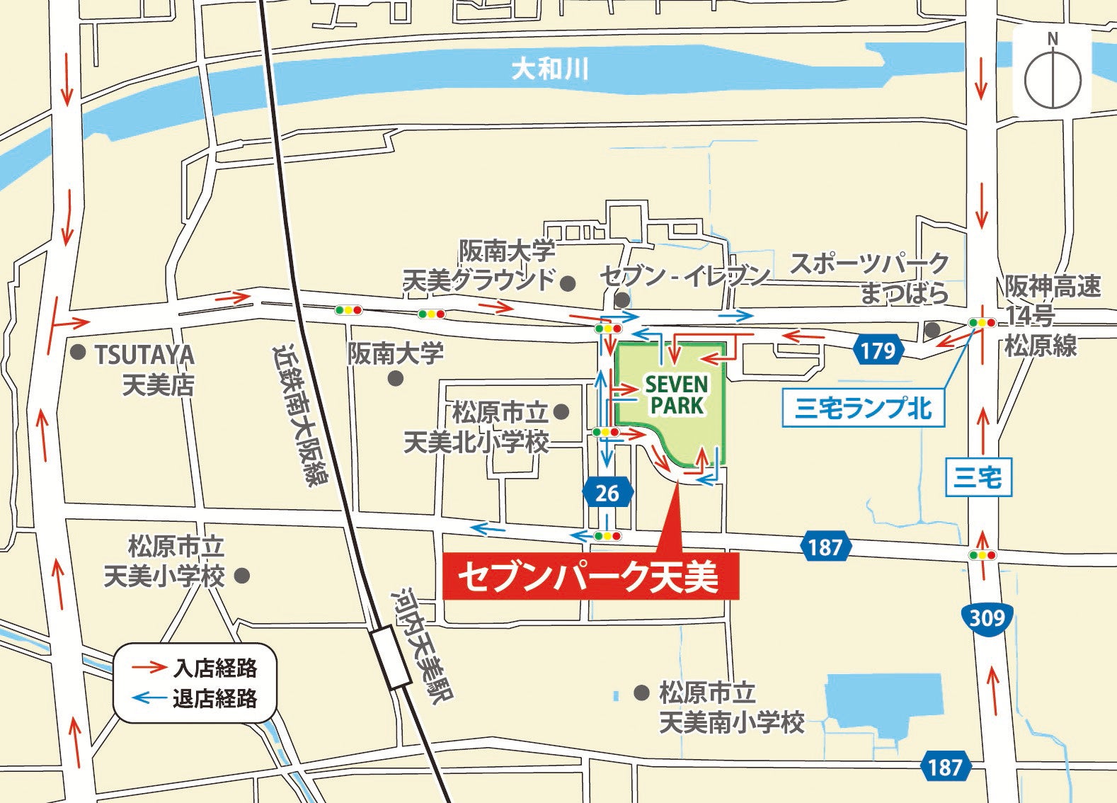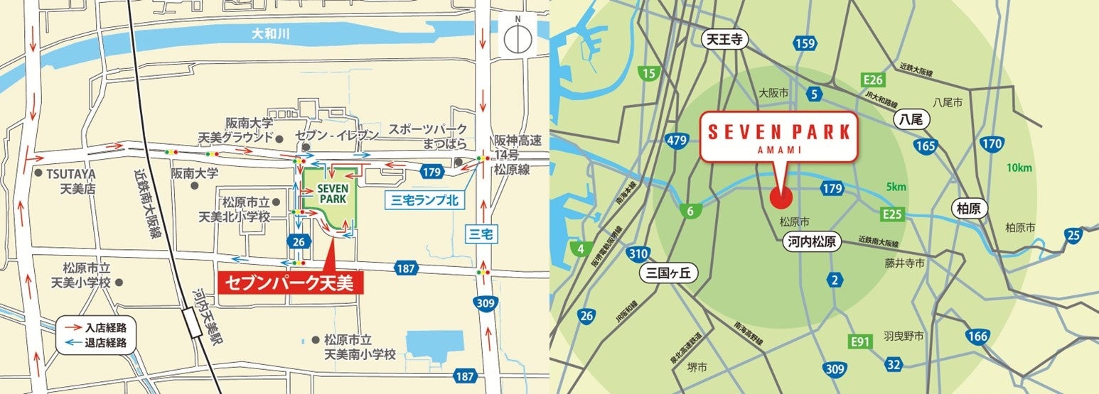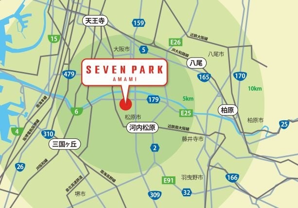セブンパーク天美が位置する「松原天美」は、国道309号、阪神高速「大和川線・松原線」が交わるクロスポイントに位置し、広域からのアクセスに優れております。