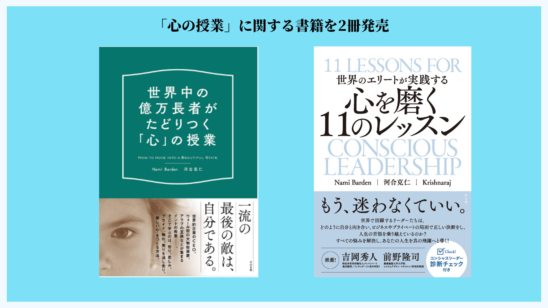 現在も書籍「世界中の億万長者がたどりつく心の授業」、そして「心を磨く11のレッスン」の読者様やご縁のある方々に応援していただいております。今後もより多くの方に「心の授業」の内容を知ってもらい、日本人の働く意欲、幸福度を上げていきたいと考えています。