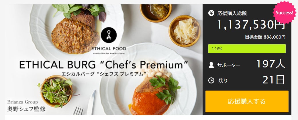 エシカルフード株式会社(東京都中央区銀座7-13-5)はクラウドファンディングサイトMakuakeにて、ブリアンツァグループのオーナーシェフ・奥野義幸氏が特製ヴィーガンソースの開発を監修したETHICAL BURG Chef’s Premium(エシカルバーグ シェフズ・プレミアム)シリーズの先行予約販売を4月27日(水)より開始しました。そして、皆様の多大なご支援のおかげもあり、初日で目標金額(888,000円)を達成いたしました。