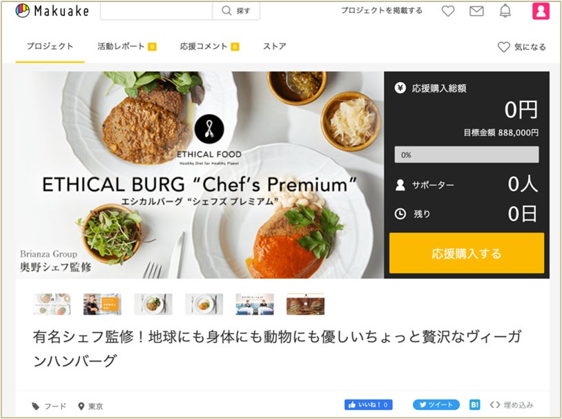 2022年4月27日より、奥野義幸氏が監修した特製ソースを合わせたETHICAL BURG Chef’s Premium (エシカルバーグ シェフズ・プレミアム)シリーズをクラウドファンディング「Makuake」にて先行予約販売中。目標金額は、888,000円とし、調達した資金は、「食生活が地球環境を守る」という新しい価値観を普及するため、SNSやイベント出展等のプロモーション活動費として活用させて頂きます。また、商品改良及び新商品開発にも資金を活用させて頂きます。ご支援いただいた方へは、シェフズ・プレミアム2種をはじめ、エシカルフードのオリジナル製品「エシカルバーグ」「エシカルソーセージ」をリターンとしてお得な早割価格にてご提供いたします。更に、今回特別に、スペシャルリターンとして、La Brianza(六本木ヒルズ)での奥野シェフお任せディナーやランチ(2名分)がセットになったプランもご用意しています。奥野シェフは、この商品について「単なる肉の代替品ではなく、お肉を控えたい日に食べる新しい食のポテンシャル」を提案したい、とこのプロジェクトに賛同していただいています。「食通が満足するヘルシーバーグ」を是非お試しください。