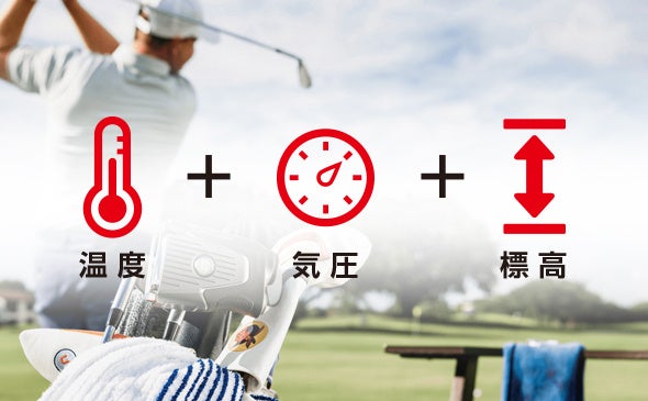 高低差を考慮した距離だけでなく、ゴルフ場の気温・高度(気圧)を加味した推奨距離を算出する「エレメント機能」、さらに最もプレイするゴルフ場の標高をあらかじめ入力することで、プレイ中のゴルフ場の標高の変化を読み取り、推奨距離に反映する「ホームエレベーション機能」を搭載。