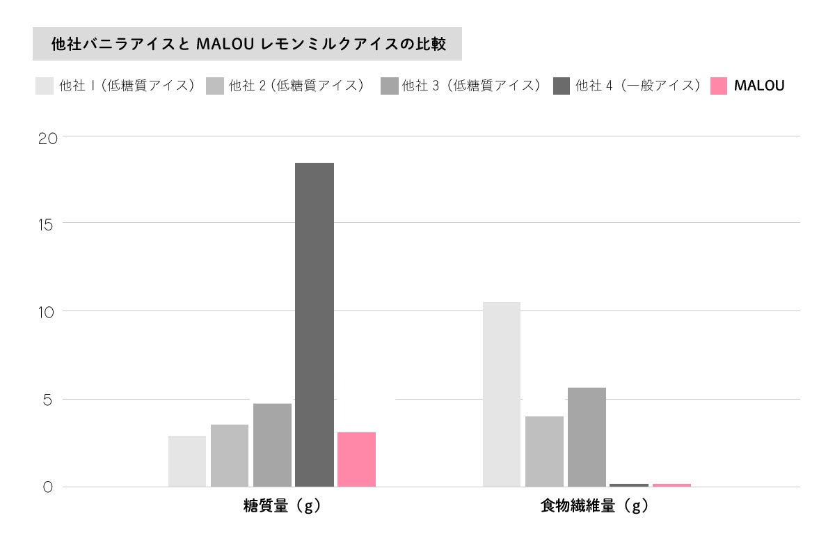 MALOUのアイスは、1個(100ml)あたりの実質糖質量*が3.1g(レモンミルク)と5.72g(ナッツ&ナッツ)。一般的なアイスに比べて80~68%の糖質オフ*を実現しています(数値はいずれも試作段階での推定値です)。