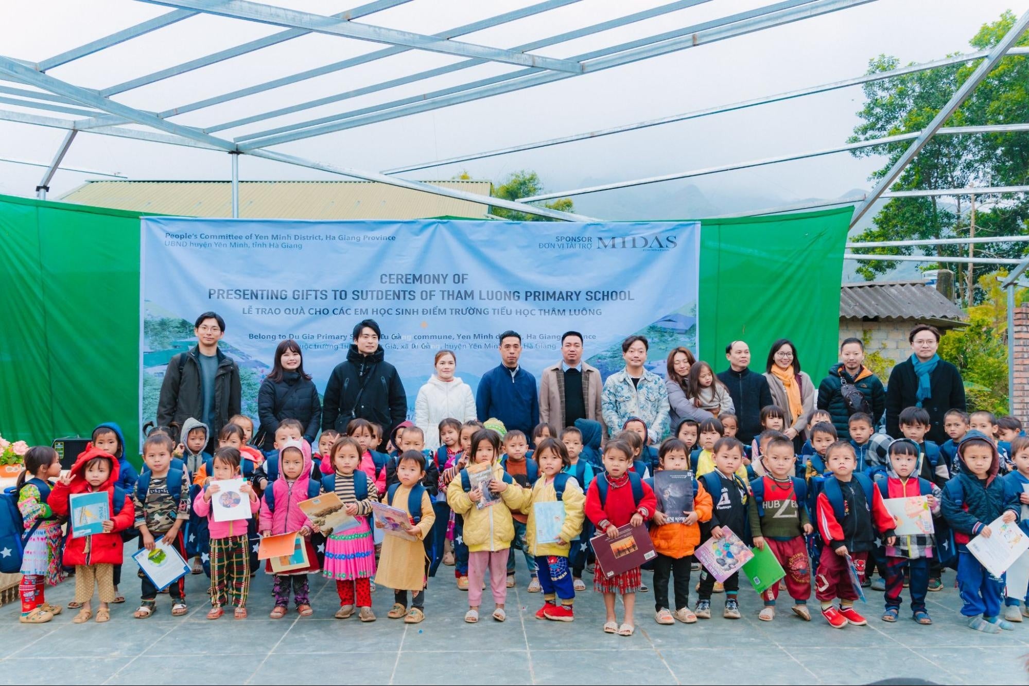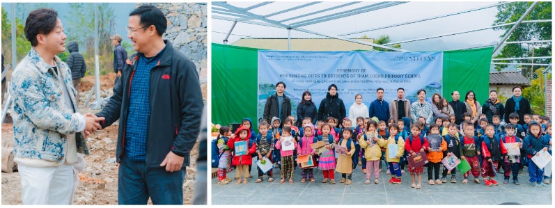 ベトナムでの学校建設プロジェクトの現地視察ということで、2022年12月にミダス財団の理事長である吉村英毅をはじめとした財団メンバーがTham Luong分校の建設現場を訪れ、生徒たちにバッグや本などをプレゼントしました。また、学校の職員や現地当局の方々と直接コミュニケーションを取り、現状や要望についてヒアリングを実施しました。
