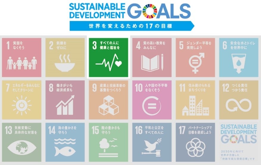 当社のこの取り組みは国連サミットで採択された世界共通の持続可能な開発目標であるSDGsの 17目標のうち「3:すべての人に健康と福祉を」の達成を目指しています。