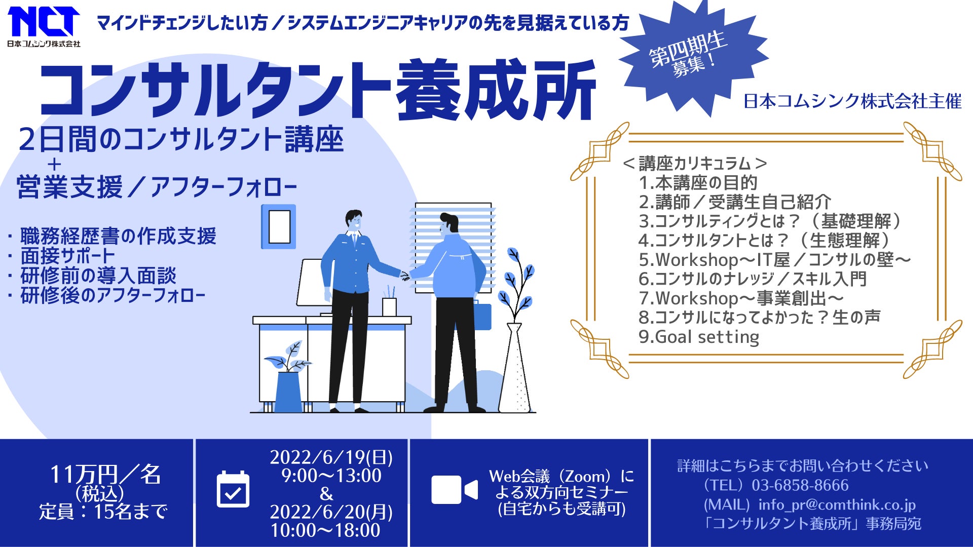幅広い分野においてコンサルティング/システム開発を手掛ける日本コムシンク株式会社(所在地:大阪市西区江戸堀/東京都千代田区霞が関、代表取締役:山里真元※以下、日本コムシンク)では、2022年6月に「コンサルタント養成所」の開所を決定、システムエンジニアの方を対象に、第四期生を募集する運びとなりました。