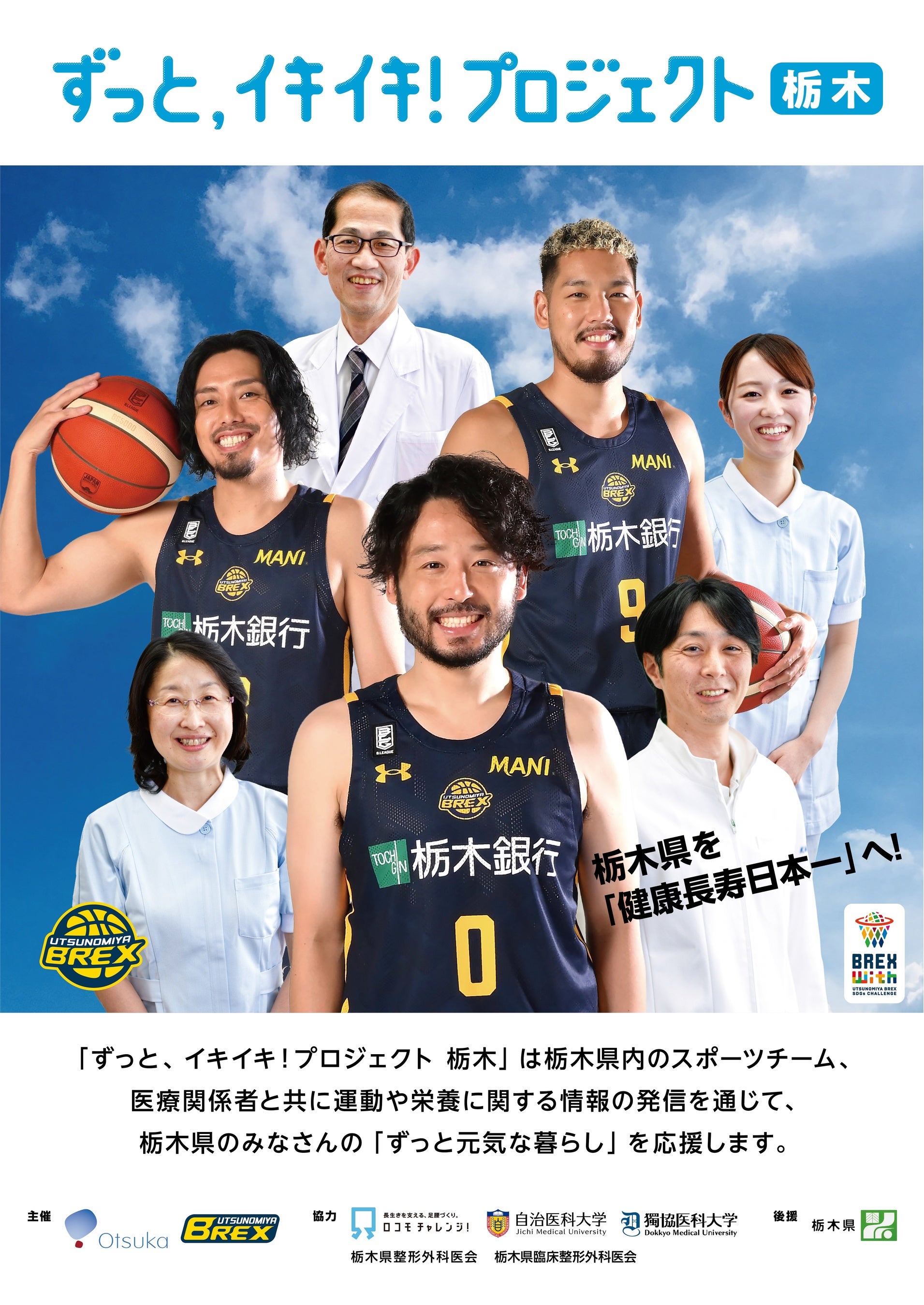 こうした背景を踏まえ、栃木県民の健康課題改善を目的とした「ずっと、イキイキ!プロジェクト」を発足します。本プロジェクトでは、栃木県の健康寿命日本一を目標に掲げ、県内の団体や企業、医師の方々と連携した取り組みを実施して参ります。まずは、宇都宮ブレックス専属チアリーダー「BREXY」による、医師監修のもと考案した『ロコモ体操』の発信など、栃木県民を巻き込んだ施策を展開していきます。