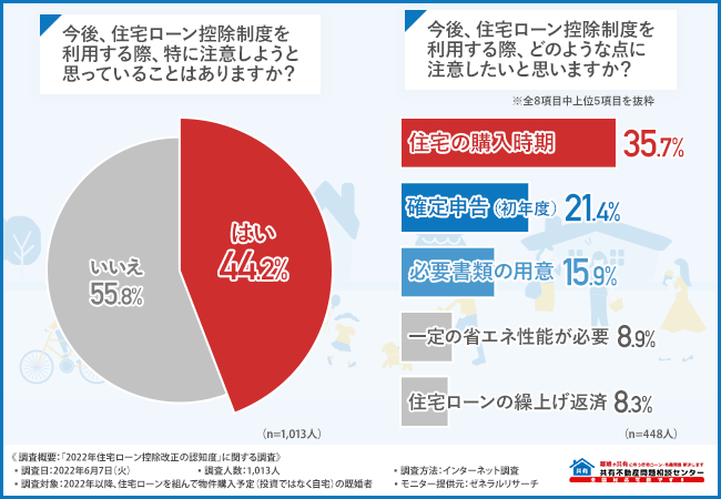 そこで、「今後、住宅ローン控除制度を利用する際、特に注意しようと思っていることはありますか?」と質問したところ、『はい(44.2%)』『いいえ(55.8%)』との回答になりました。