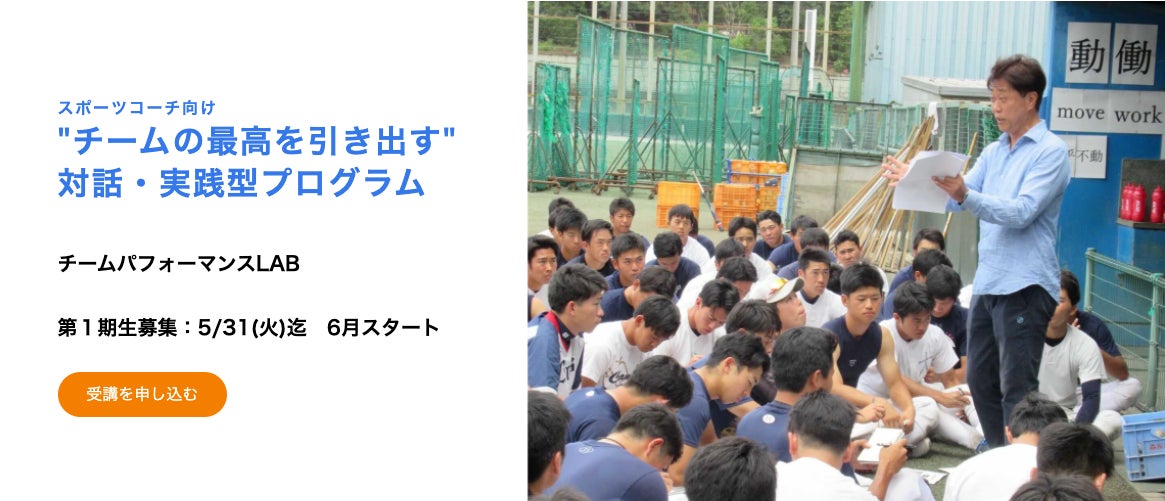 株式会社フィールドセンス(東京都港区:代表取締役 布施努)は、“今いる選手の力を最大限に発揮して、チームを勝利に導きたい”、“チームの最高を引き出したい”と考えているスポーツ指導者向けに、スポーツ心理学の知見と実績を凝縮したオンラインプログラム、「チームパフォーマンスLAB」を6月より開講いたします。