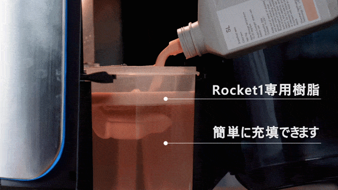 Rocket 1の樹脂タンクは最大3.7kgもの樹脂を入れることができ、大型モデルを作ることができます。その為、大型を作る際も一気に樹脂を使いきって、途中でなくなってしまうことはありません。Rocket1の専用樹脂は下の画像の通り、簡単に充填できます。