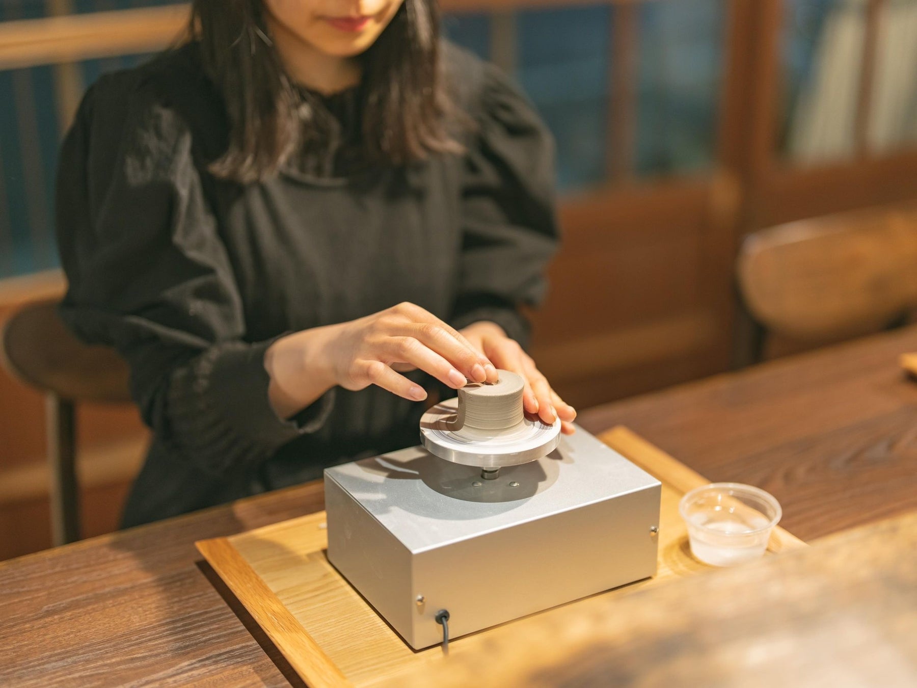 オリジナルの小型電動ろくろでカウンター陶芸をお楽しみください。