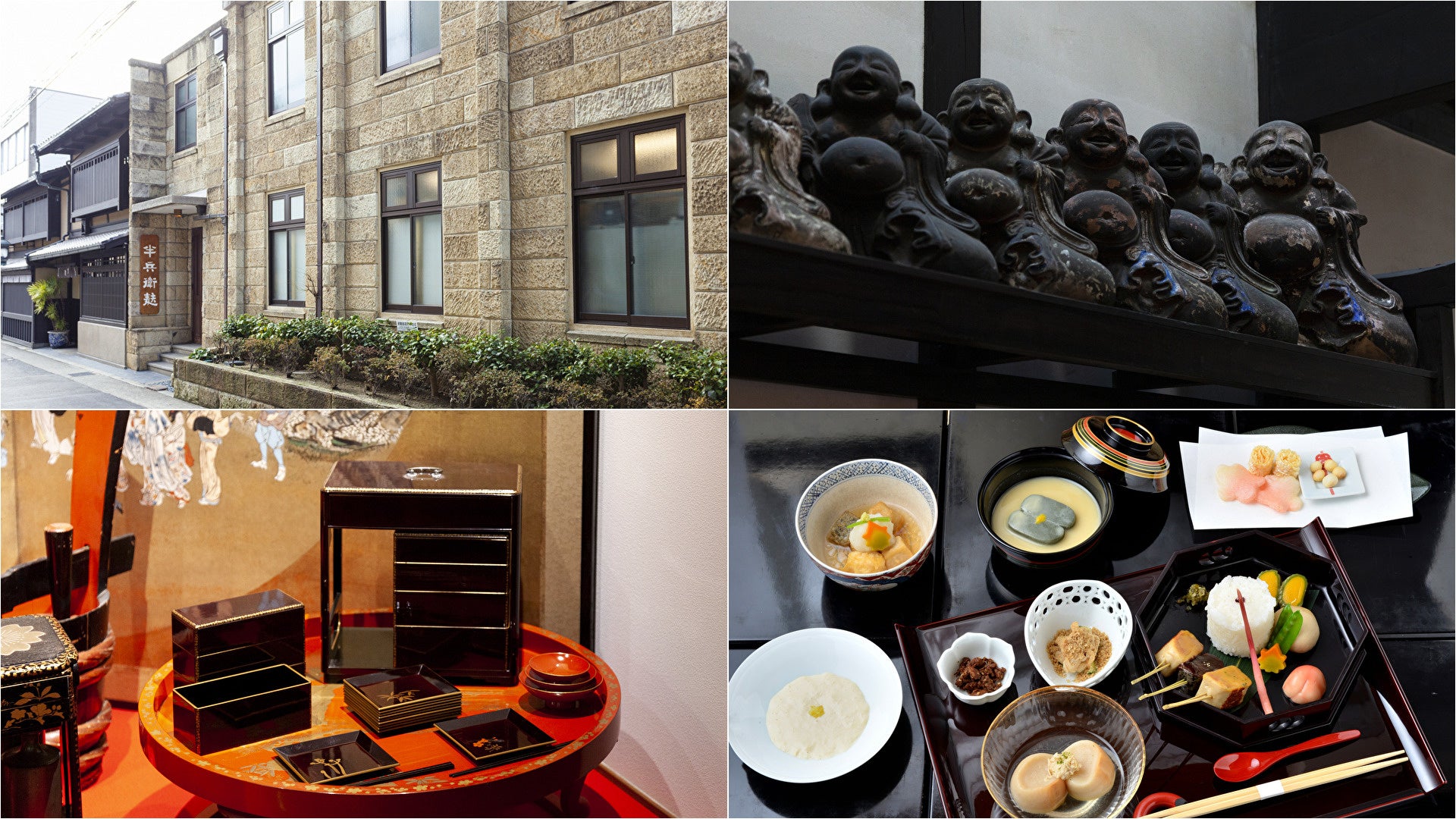 明治の京町家と昭和初期の洋館の外観は、美しいコントラスト。まずは、中庭を通って京町家にあるお辨當箱(べんとうばこ)博物館へ。精緻で華やかな手仕事から、戦国から江戸時代の風流さが思い浮かぶようです。古き良き時代に思いを馳せつつ、おくどさん(台所のかまど)や台所の守り神・7体の布袋(ほてい)さん、そして井戸など、昔の京町家を通り抜けると、その先に続く洋館は、和空間でありながら、大正ロマン風の設えが映える独特の佇まい。お麩とゆばのお料理「むし養い」を召し上がっていただいてから、中庭を通って五条ビルへ。まるで数百年の時をタイムトリップしたかのような不思議な感覚に陥ります。