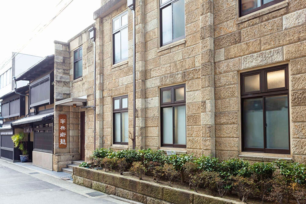 鴨川をのぞむガラス張りの本店(五条ビル)には、1階に半兵衛麸の商品が揃うショップ、3階にはお麩やゆば。豆乳などを使ったアイデアメニューが豊富な「Cafeふふふあん」。現代の食生活に合うお麩やゆばの創作料理を提案しています。石造の昭和の洋館には、オーセンティックなお麩とゆばのお料理「むし養い」を供する「茶房 半兵衛」。いずれも、隣接した工場から届く、できたてのお麩やゆばが味わえます。