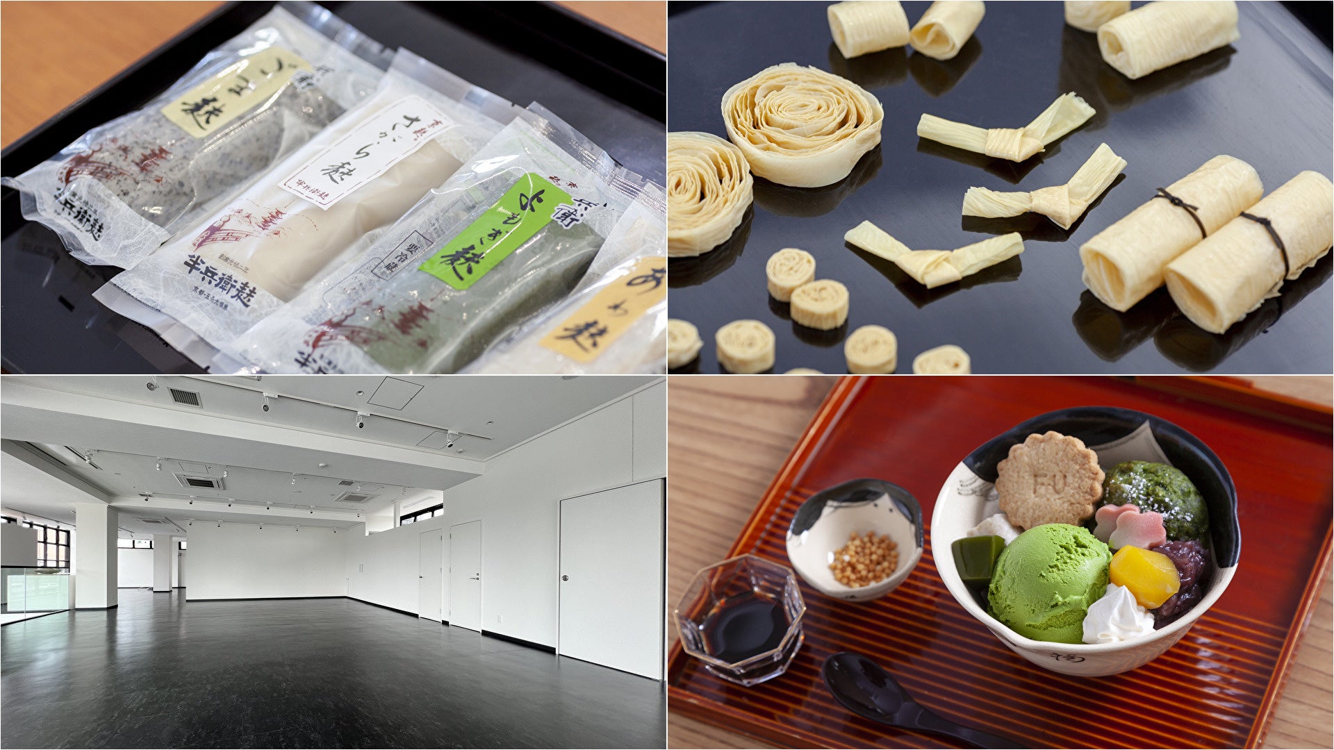 五条ビルの1階はなま麩にやき麩、ゆば、甘味など、半兵衛麸の商品ほぼすべてを扱っています。お土産や贈答品なども充実し、日持ちに優れ、使いやすい冷凍品もあります。2階はイベントスペース「ホールKeiryu」。さまざまなイベントが開催されており、時には京都発信の現代アートの展覧会などが開かれていることも。