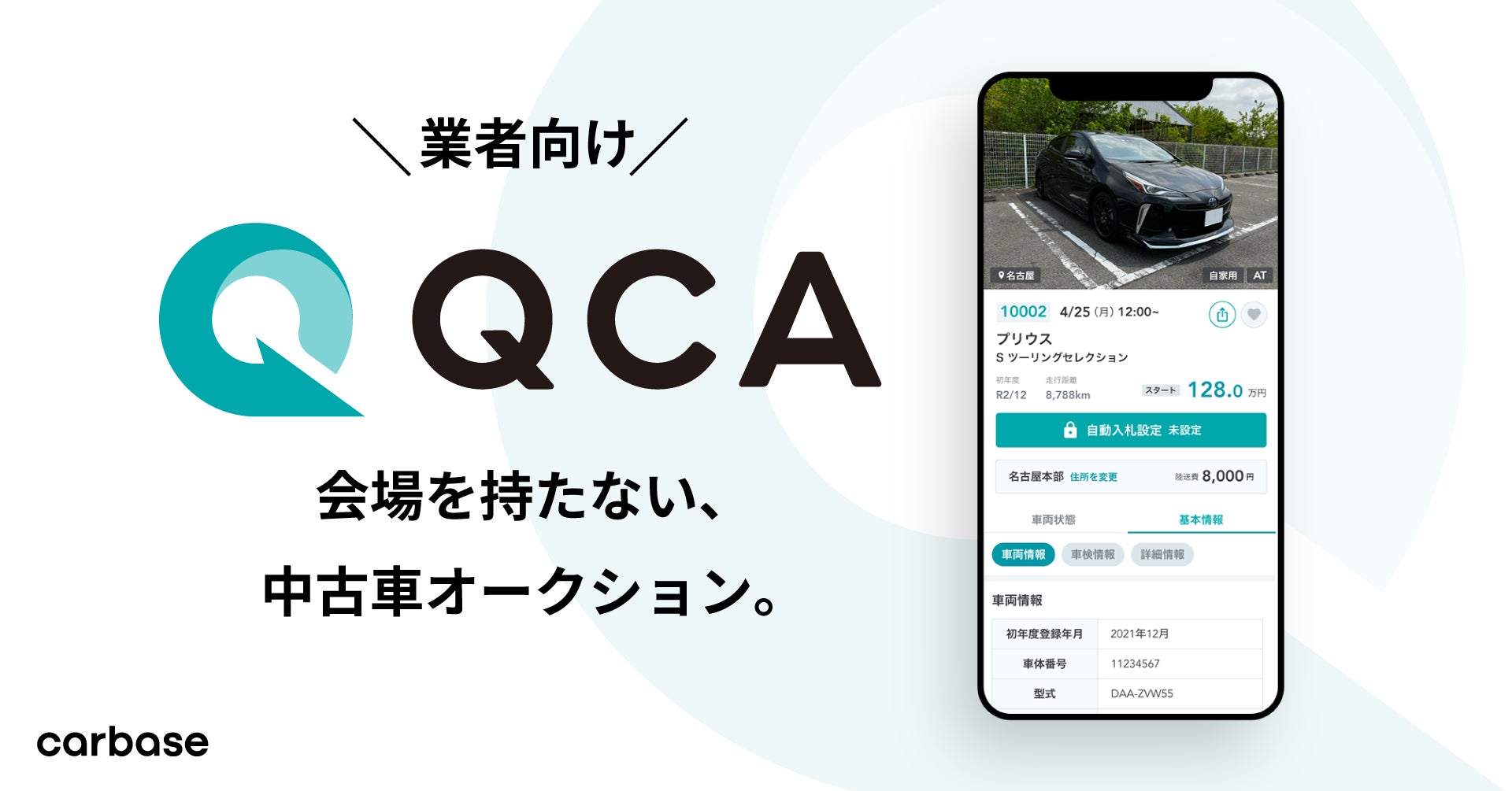 『QCA』はカーベースが提供する日本全国どこからでも参加でき、出品から落札、さらには陸送に関わる業務をスマホ1つで「オンラインで」完結できる「会場を持たない」中古車オークションサービスです。