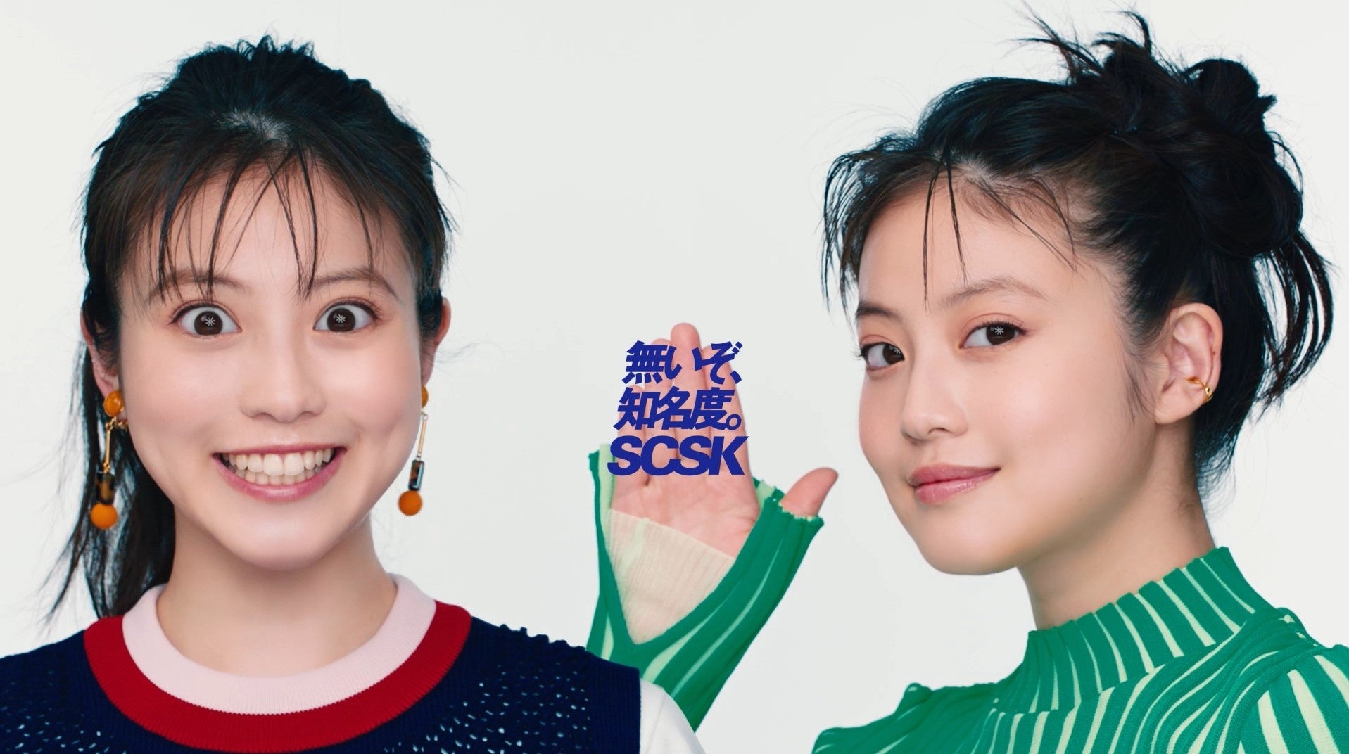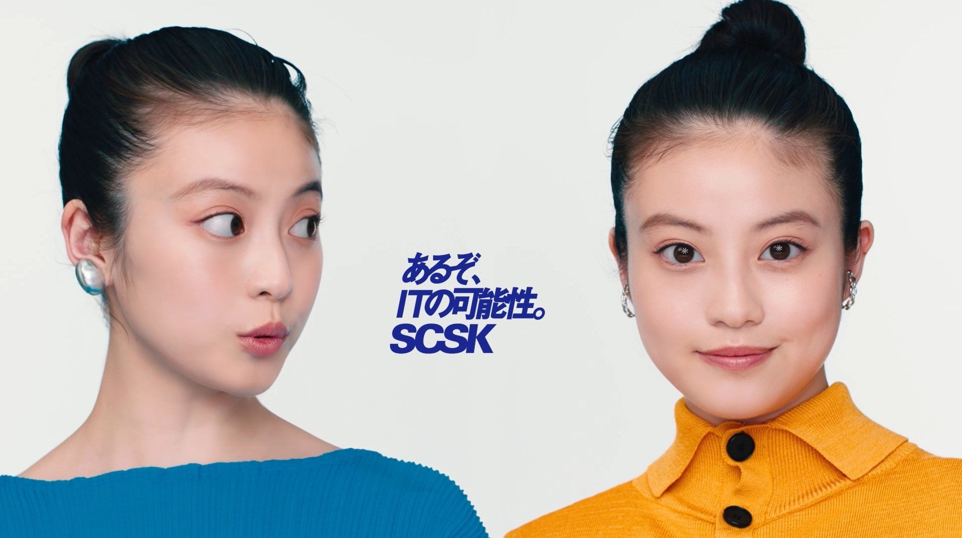 グリーンの衣装にポップなアップヘアの今田美桜さんから、 ネイビー系の衣装にラフなポニーテール姿の今田美桜さんへ…。その今田美桜さんから、イエローの衣装にお団子ヘアでほんのりモードな雰囲気を魅せる今田美桜さんへ…。独特なリズムで伝わる「無いぞ、知名度。SCSK」というメッセージ。そのメッセージは、いつの間にか「あるぞ、ITの可能性。SCSK」に変わり、ブルーの衣装に三つ編みアレンジヘアの今田美桜さんへ…。ベージュの衣装にシャープな趣を感じさせる今田美桜さんから、また、 「無いぞ、知名度。SCSK」に。