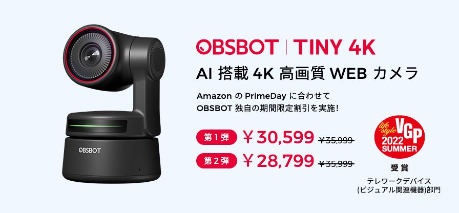 AI技術を取り入れた、これまでにない映像体験を提供する製品を展開するREMO TECH Co., Ltd.(以下、 REMO TECH社、本社:中国深圳市)は、今年のAmazonのPrime Dayに合わせて、「OBSBOT Tiny 4K」が最大7,200円オフなど、OBSBOTの各商品が割引価格で手に入る「OBSBOT Prime Week」を、2022年7月7日(木)~17日(日)の期間にて開催いたします。