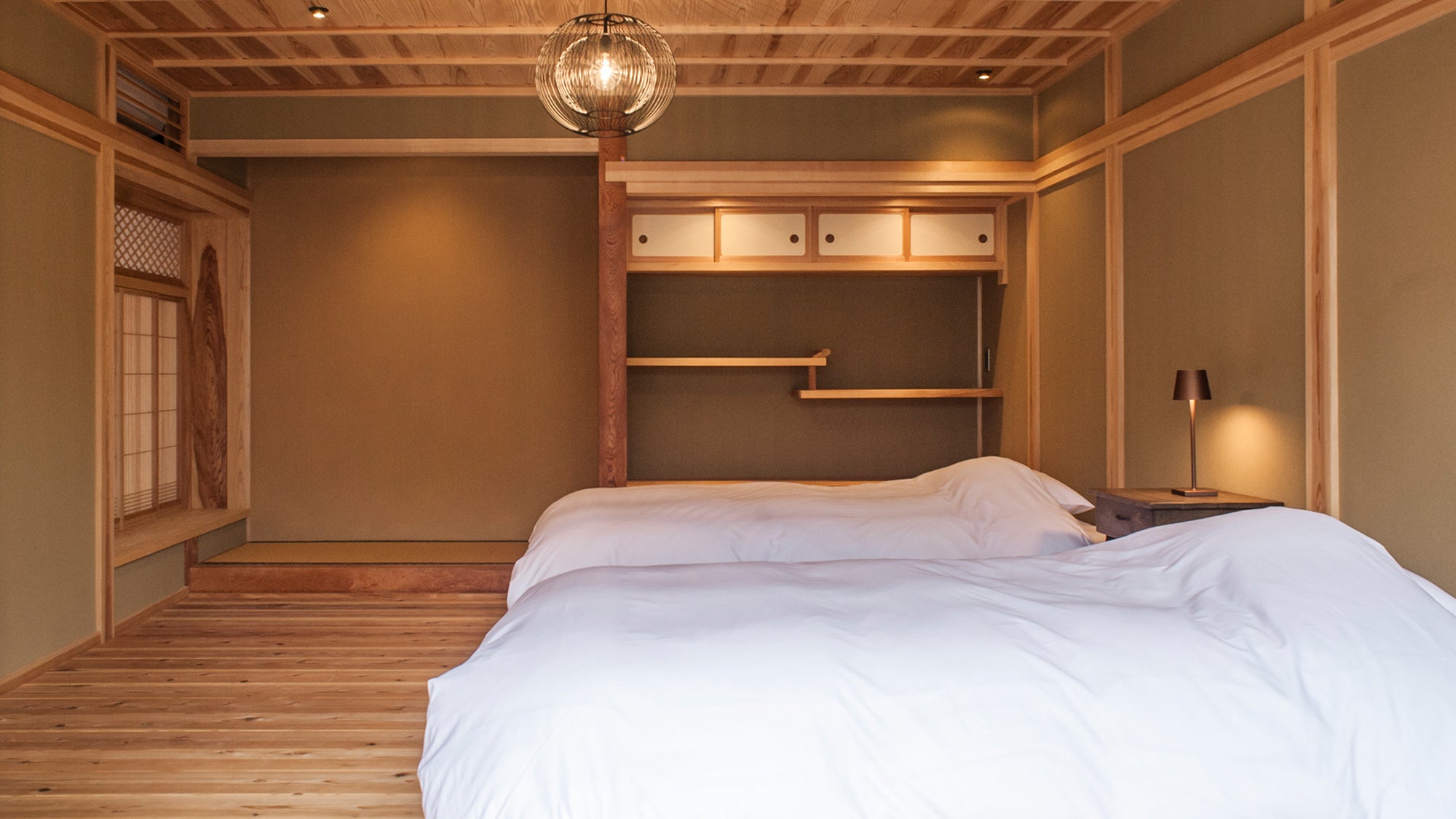お部屋専用の中庭を望める寝室と、出雲格子の窓から陽の光が差し込む居間を設けたお部屋。