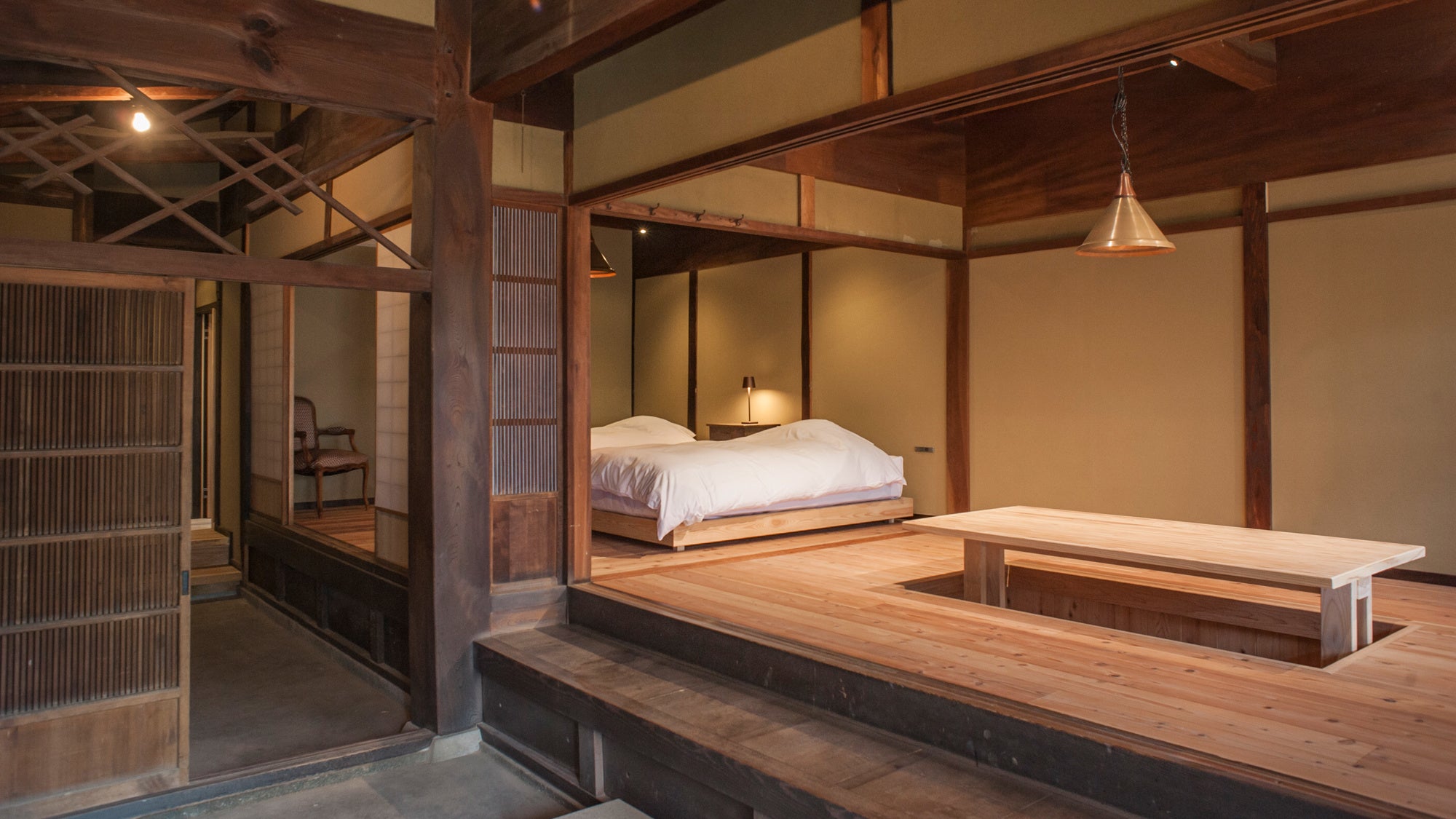 和風の落ち着いた空間にモダンな家具を設え、ガーデンテーブルのある小さな中庭を設けたお部屋。