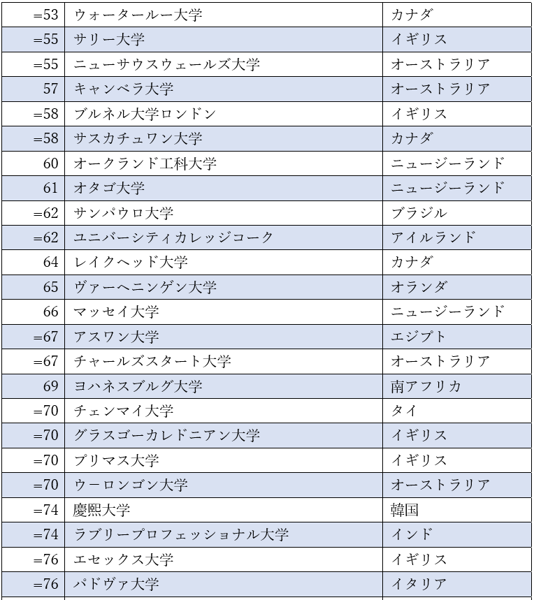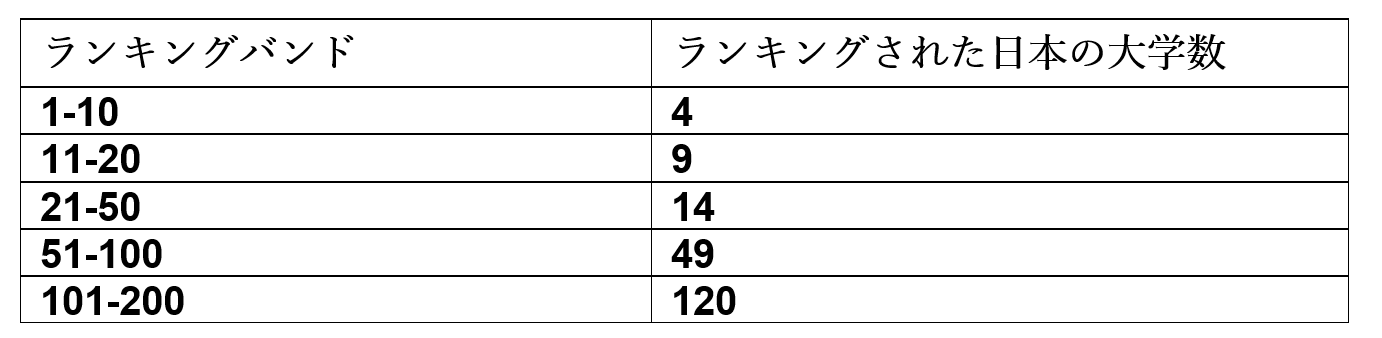 日本は全ランキングにおけるランクインが2番目に多い国であり、84の大学が参加しています。これらの機関のうち76の機関が総合ランキングにランクインしています。北海道大学は世界トップ10で10位、京都大学は同率19位です。そして 7つの大学が世界のトップ200にランクインしています。これは、アジア諸国の中でランクイン数が最も多い成績です。(タイと同位)。