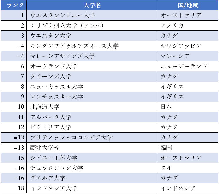 - SDG2(飢餓をゼロに):日本はトップ10に2校がランクインし、北海道大学が1位、京都大学が3位を獲得。